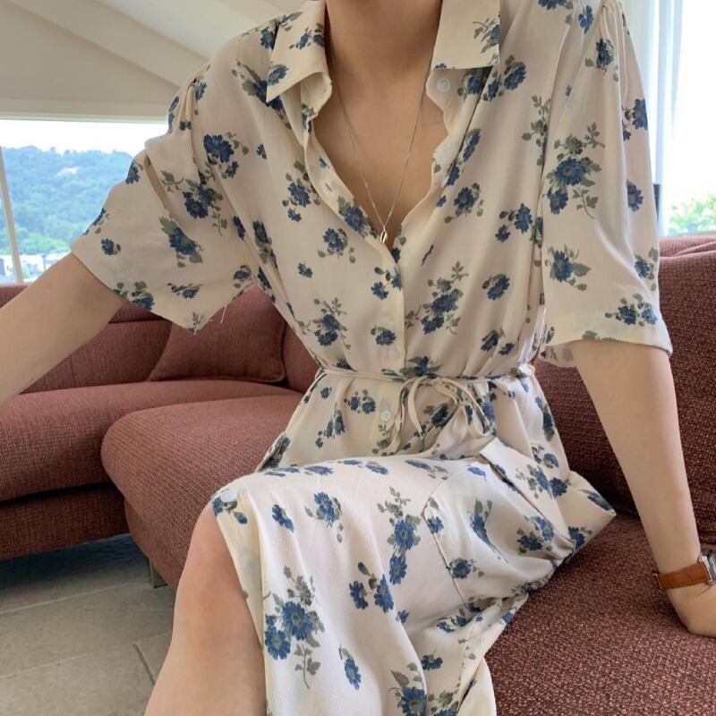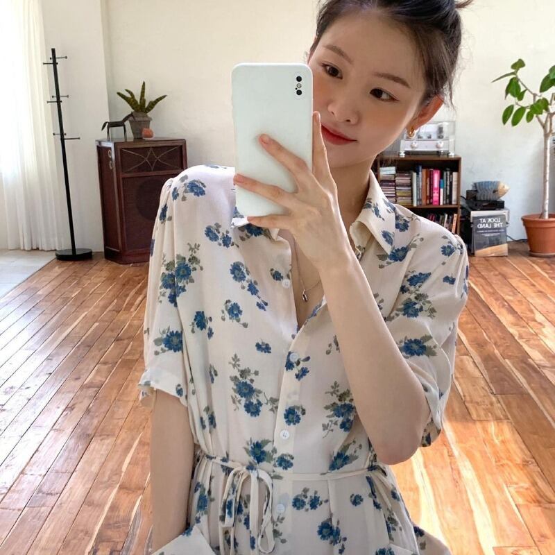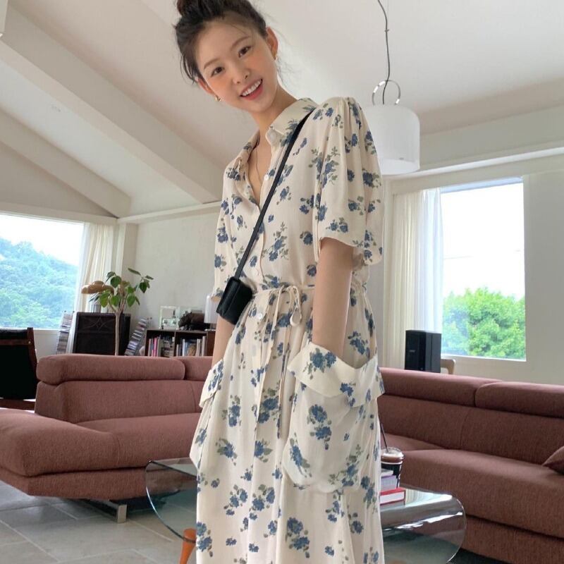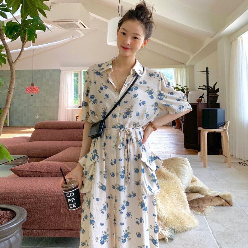 サマースタンダードフローラルギャザースリーブシャツ ドレス レトロ 夏物 花柄 韓国婦人58566541616