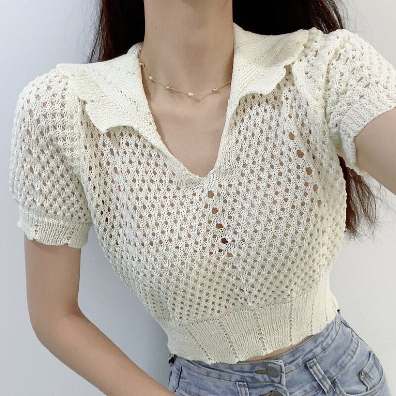 メッシュウェストショートニットセーター レディースサマースタイルレースシャツ 大人ガーリー スウィート キュート カジュアル 夏物 韓国婦人98896304419
