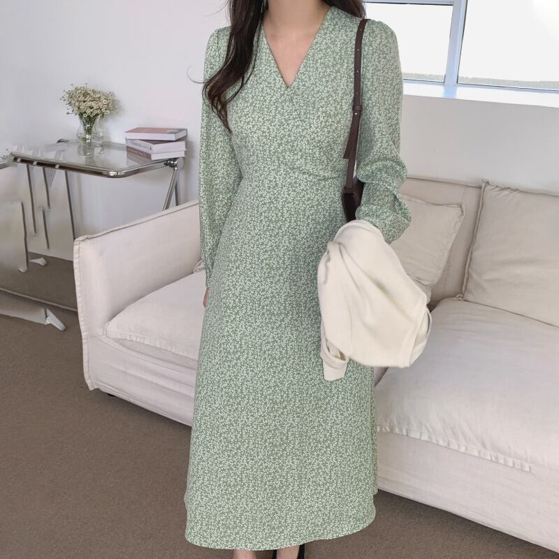 スプリングスタイルVネックフローラルドレス ロング長袖スリーブシフォンスカート 春物 花柄 韓国婦人67183293425