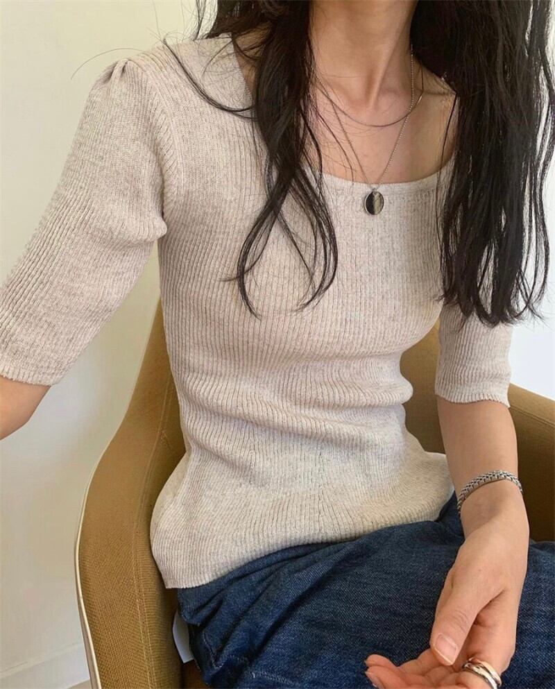 サマーカラーソリッド スリム薄手ニットセーター トップス レディース 夏物 ソリッドカラー スクウェア 韓国婦人55825645464