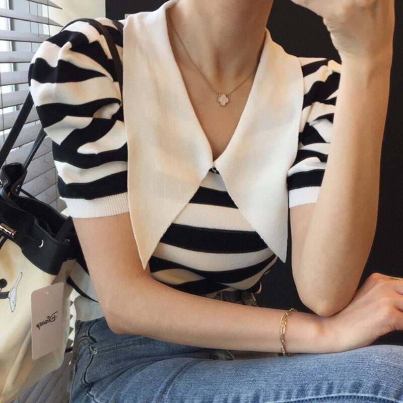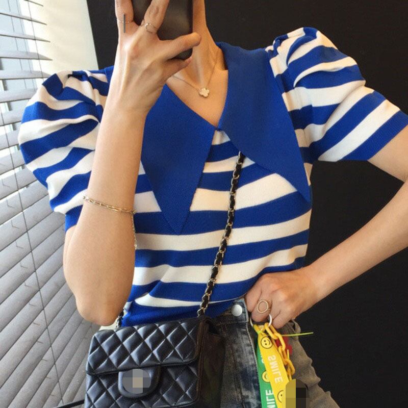 スタンダードスリーブルーズショートストライプセーター サマースタイルトップス レトロ 夏物 韓国婦人38696525544