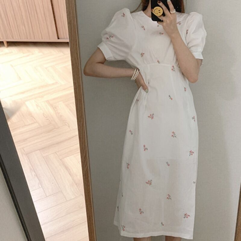 刺繍Flowerデザイン ハイウェストウェストドレス サマースリーブスカート 夏物 フラワーデザイン 韓国婦人97346712910