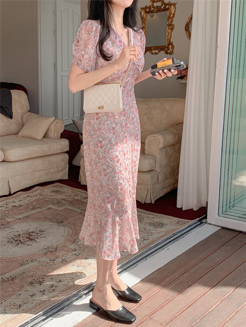 フローラルVネックプリーツスリーブドレス サマーロングシフォンスカート 夏物 花柄 韓国婦人47491083348