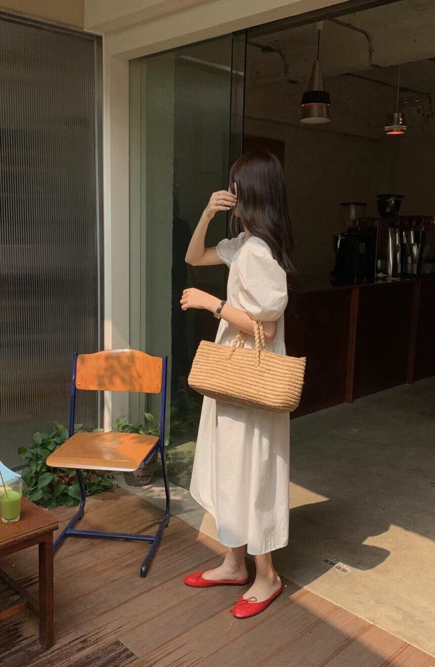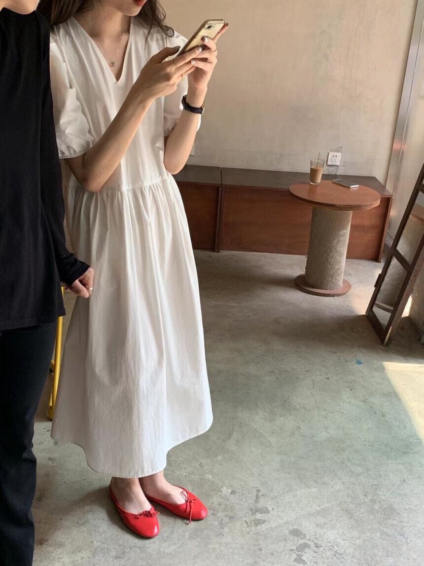 Vネックスリーブルーズ薄手ソリッド カラードレス ロングスカート サマー 夏物 ソリッドカラー 韓国婦人35031046230
