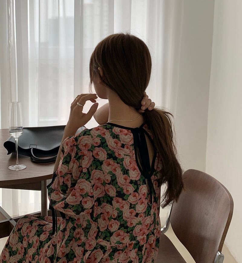 スタンダードフローラルスリーブハイウェストウェストルーズドレス サマースカート ピンク レトロ レース 大人ガーリー スウィート キュート カジュアル 夏物 花柄 レースアップ 韓国婦人38406812592