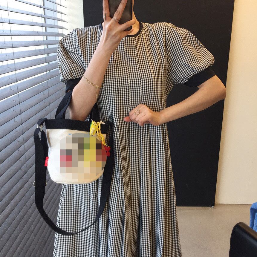 格子柄ドレス サマースタンダードラウンドネックカラーウェストスリーブルーズスカート レトロ 大人ガーリー スウィート キュート カジュアル 夏物 Oネック 韓国婦人84594613185