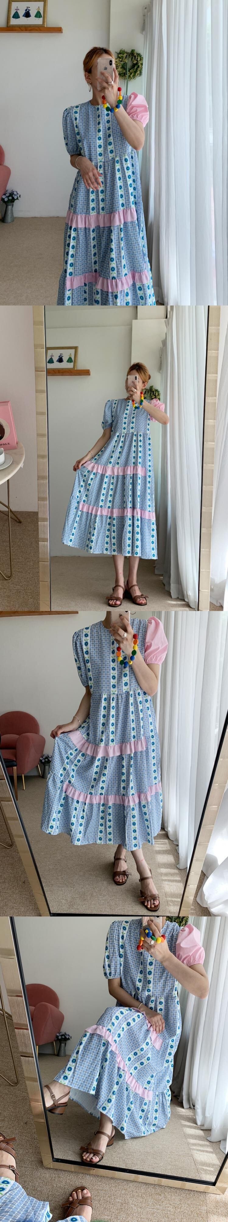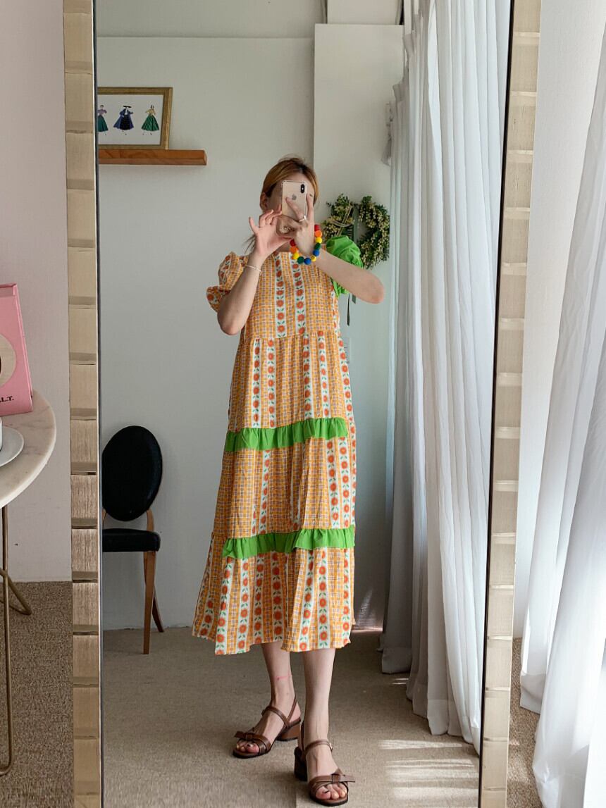 サマースリーブサイドルーズ格子柄ドレス ロングスカート 大人ガーリー スウィート キュート カジュアル 夏物 ステッチ 韓国婦人10772326462
