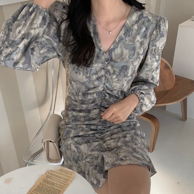 フローラルスカート スプリングサマーVネックスタンダードスリーブシフォンドレス レトロ エレガント 春物 夏物 花柄 韓国婦人12025647636