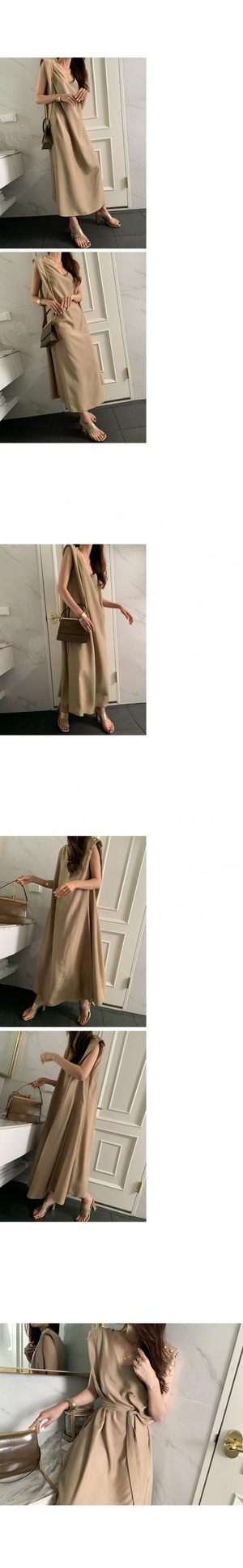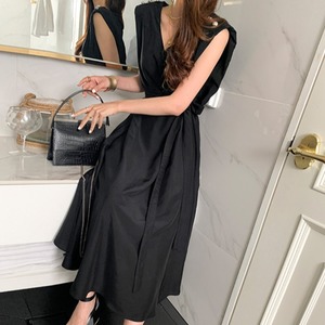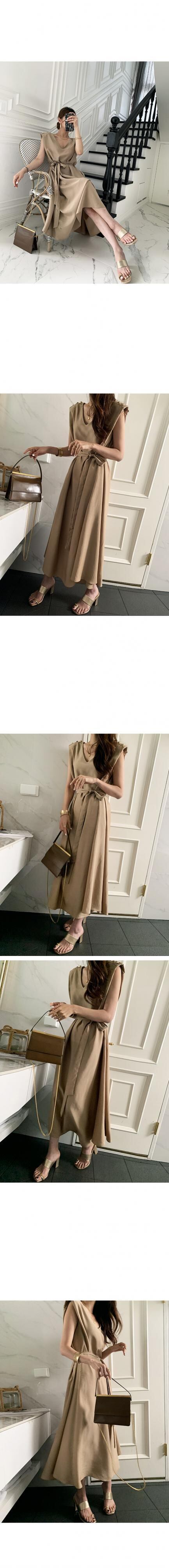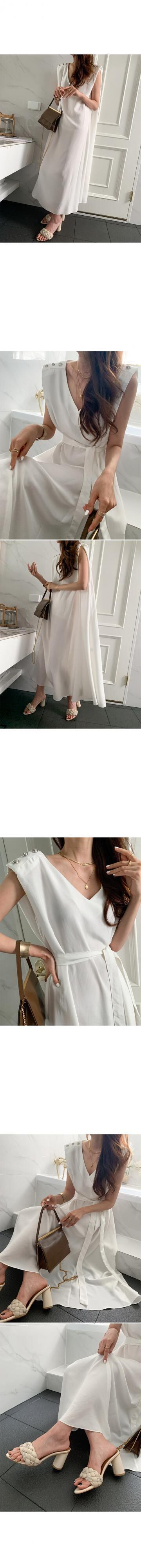 サマーVネックボタンウェストノースリーブドレス 夏物 韓国婦人45454148457