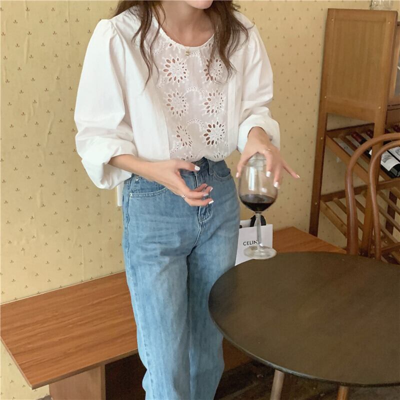 トップス サマースタンダードスタイルラウンドネックホワイトシャツ ロング レトロ 夏物 Oネック 韓国婦人21945525350