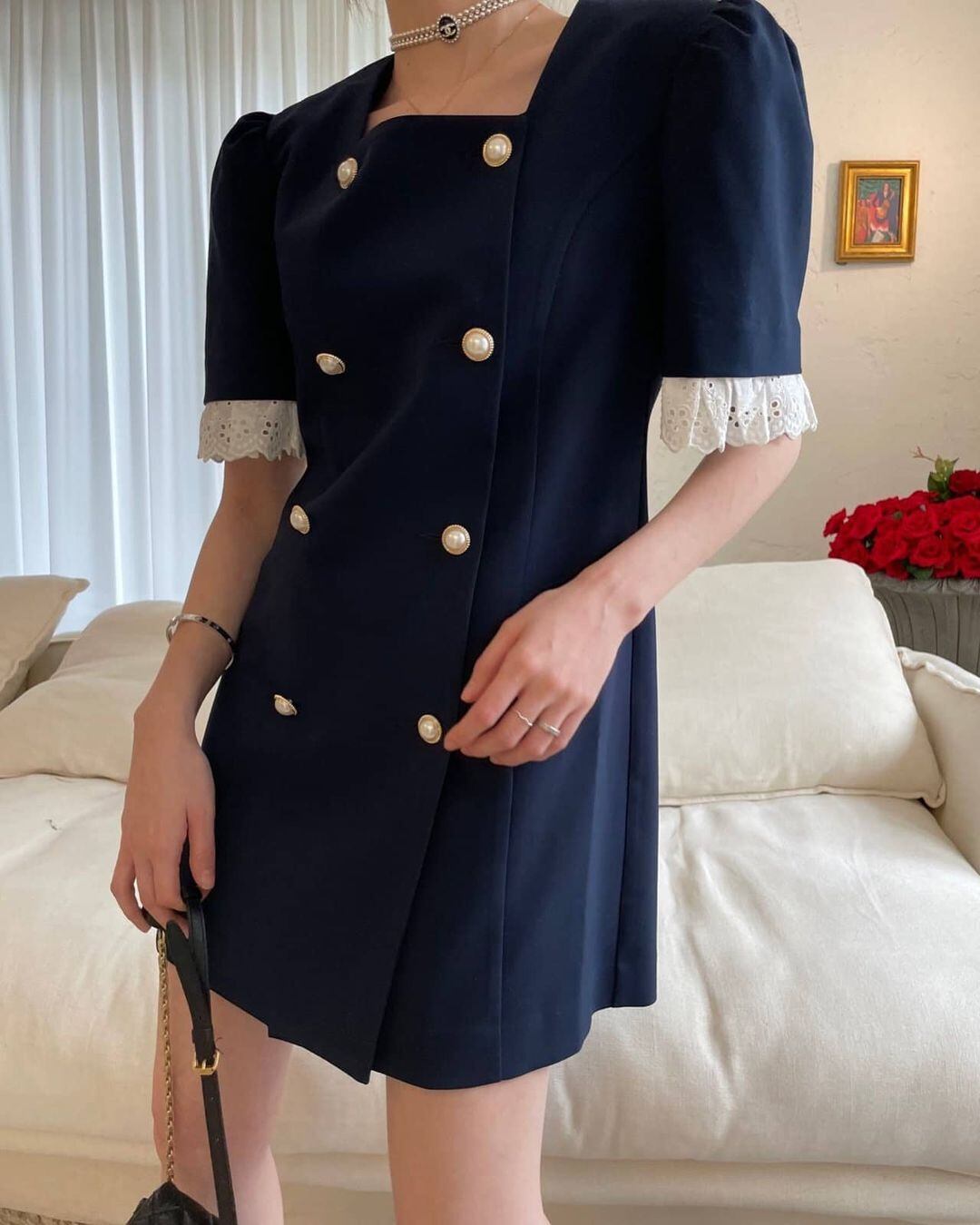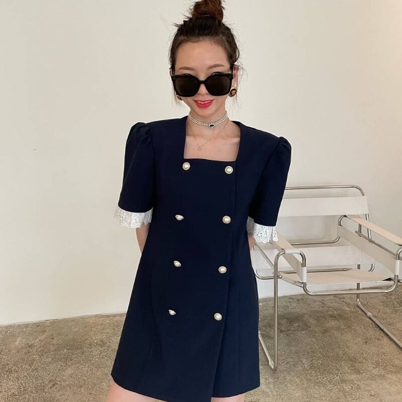 スタンダードレースカラードレス サマーダブルブレストカジュアルスカート レトロ 夏物 スクウェア ステッチ 韓国婦人67541978777