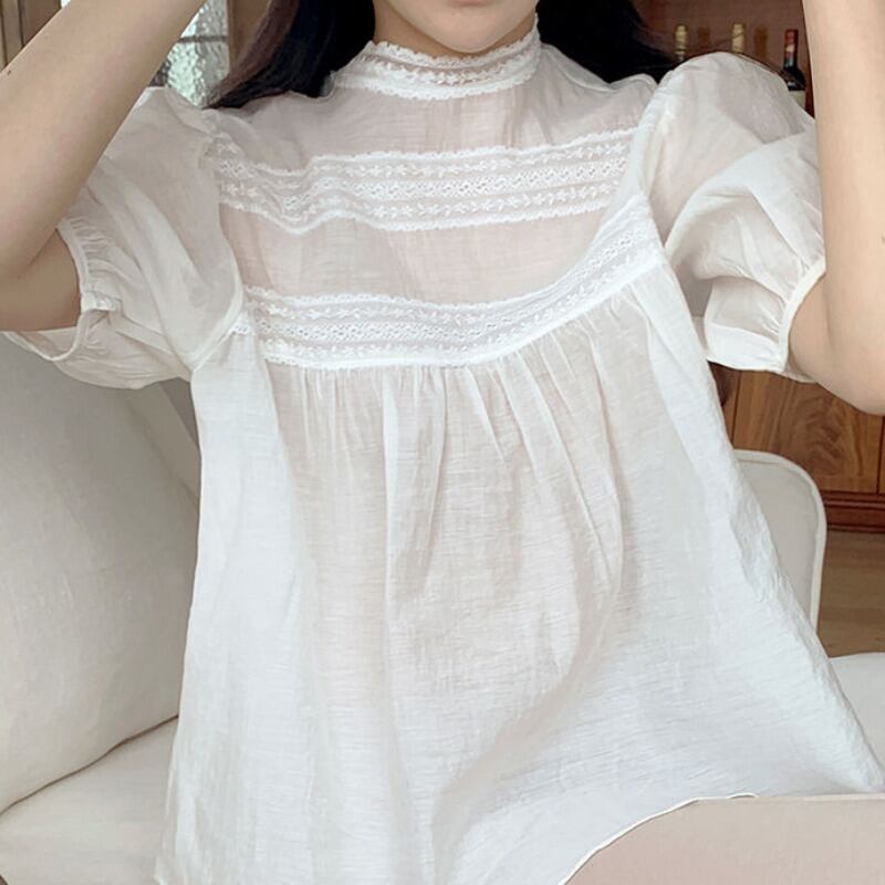 サマーレーススタイルスリーブホワイトシャツ 夏物 ステッチ 韓国婦人14396065281
