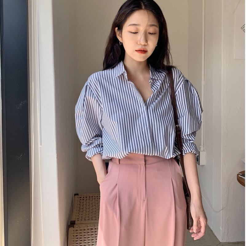 スタイルスタンダードサマーストライプシャツ カジュアルパンツ レディース ロング レトロ 夏物 韓国婦人40770993844