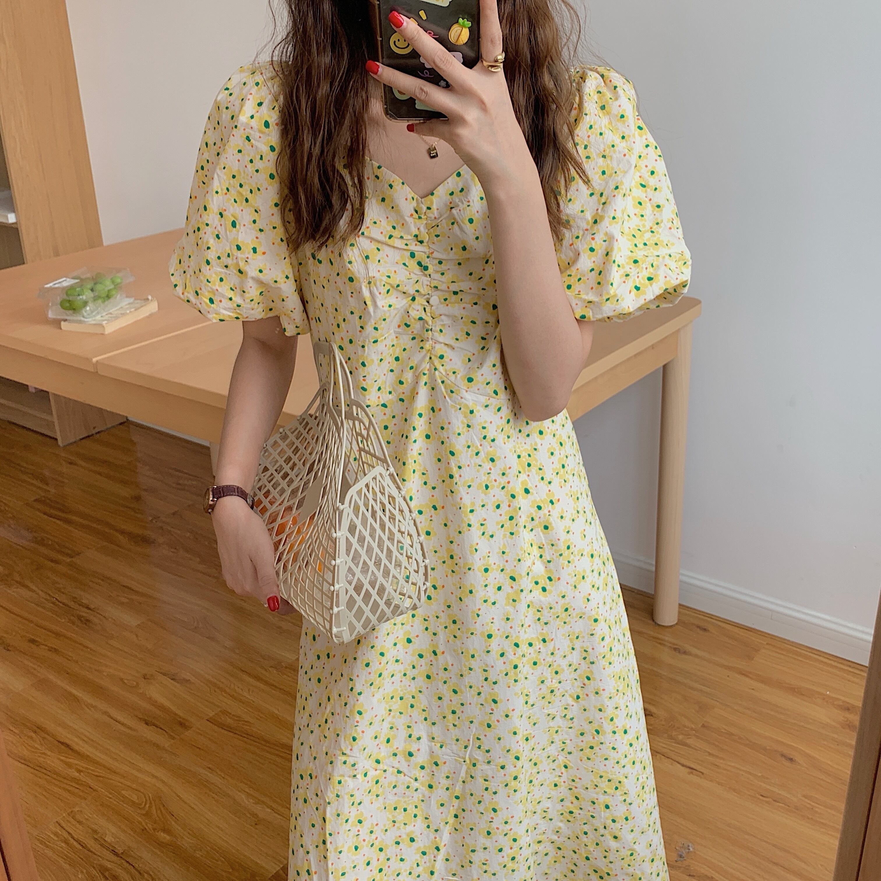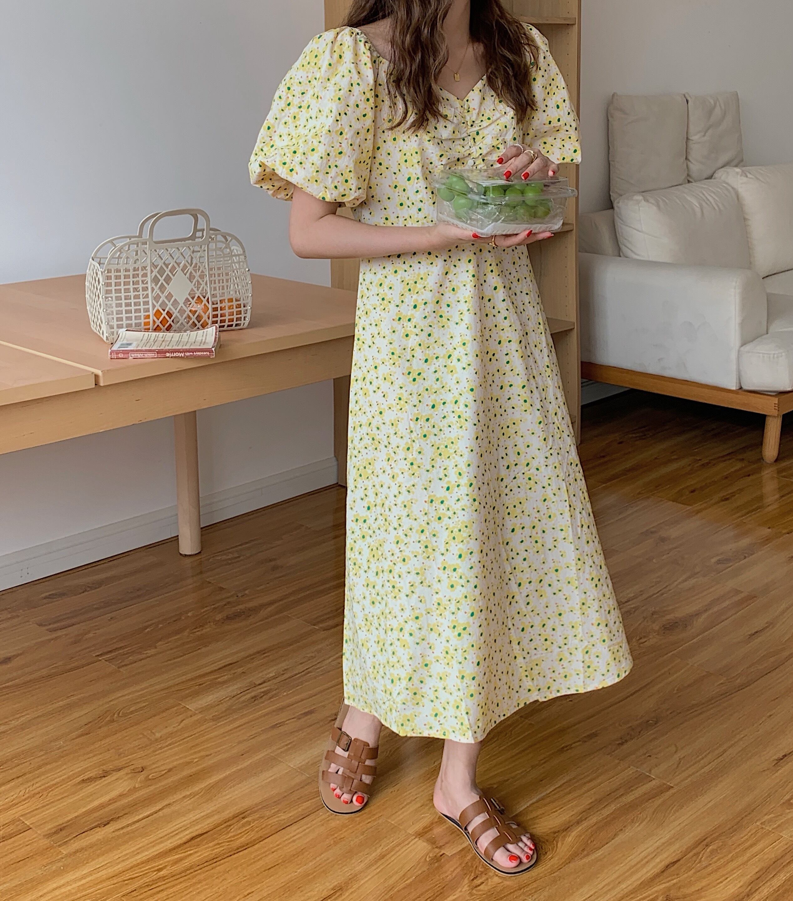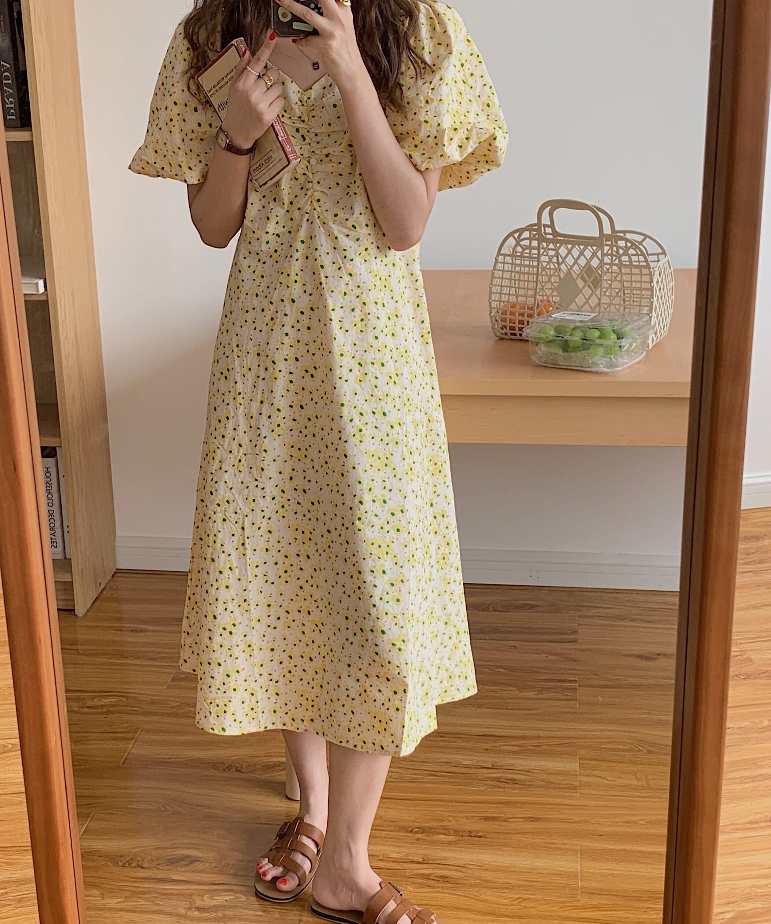 サマーVネックスリーブロングフローラルドレス レディース 大人ガーリー スウィート キュート カジュアル 夏物 花柄 韓国婦人43331979280