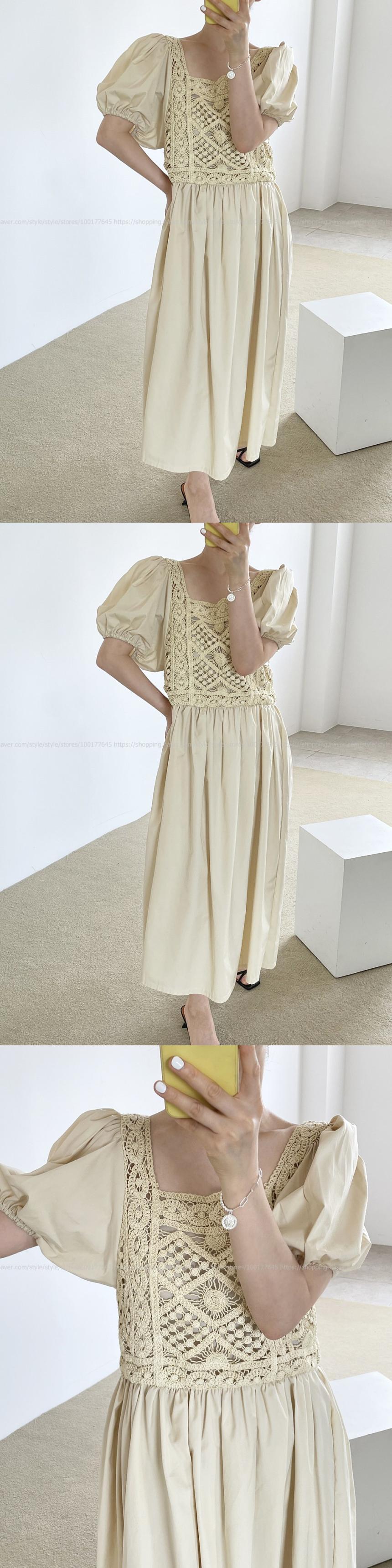サマーレースハイウェストウェストスリーブドレス ロングスカート 夏物 スクウェア ステッチ 韓国婦人5070731357