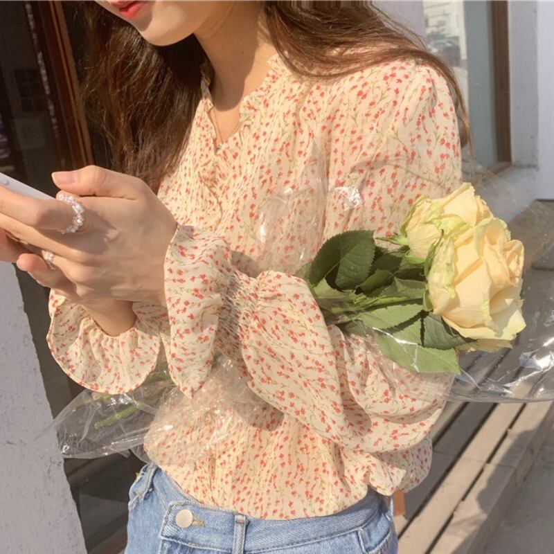 フローラルブラウス サマーVネックシフォンシャツ ロング 大人ガーリー スウィート キュート カジュアル 夏物 花柄 ステッチ 韓国婦人12015400267