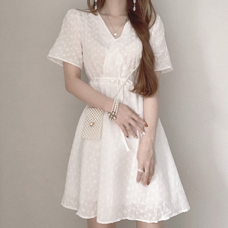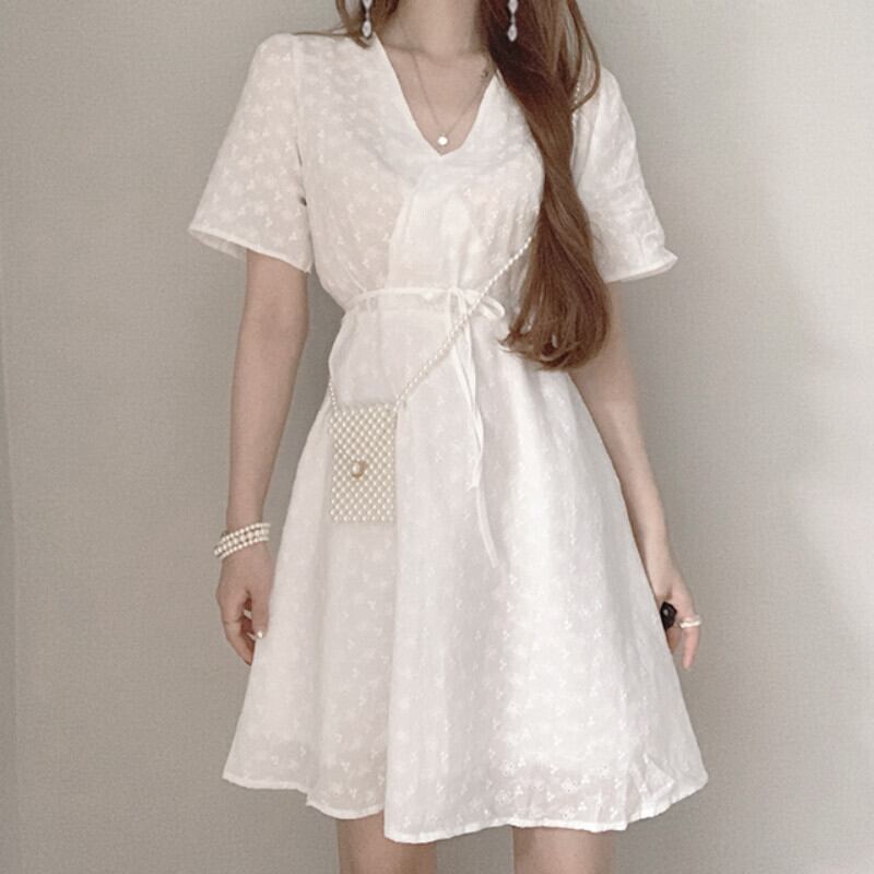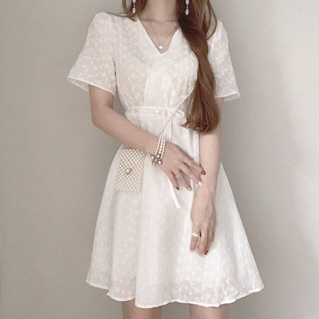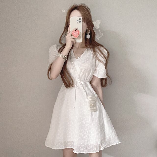 サマーVネックスリーブウェストジャカードドレス 夏物 韓国婦人24017282248