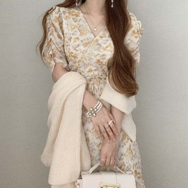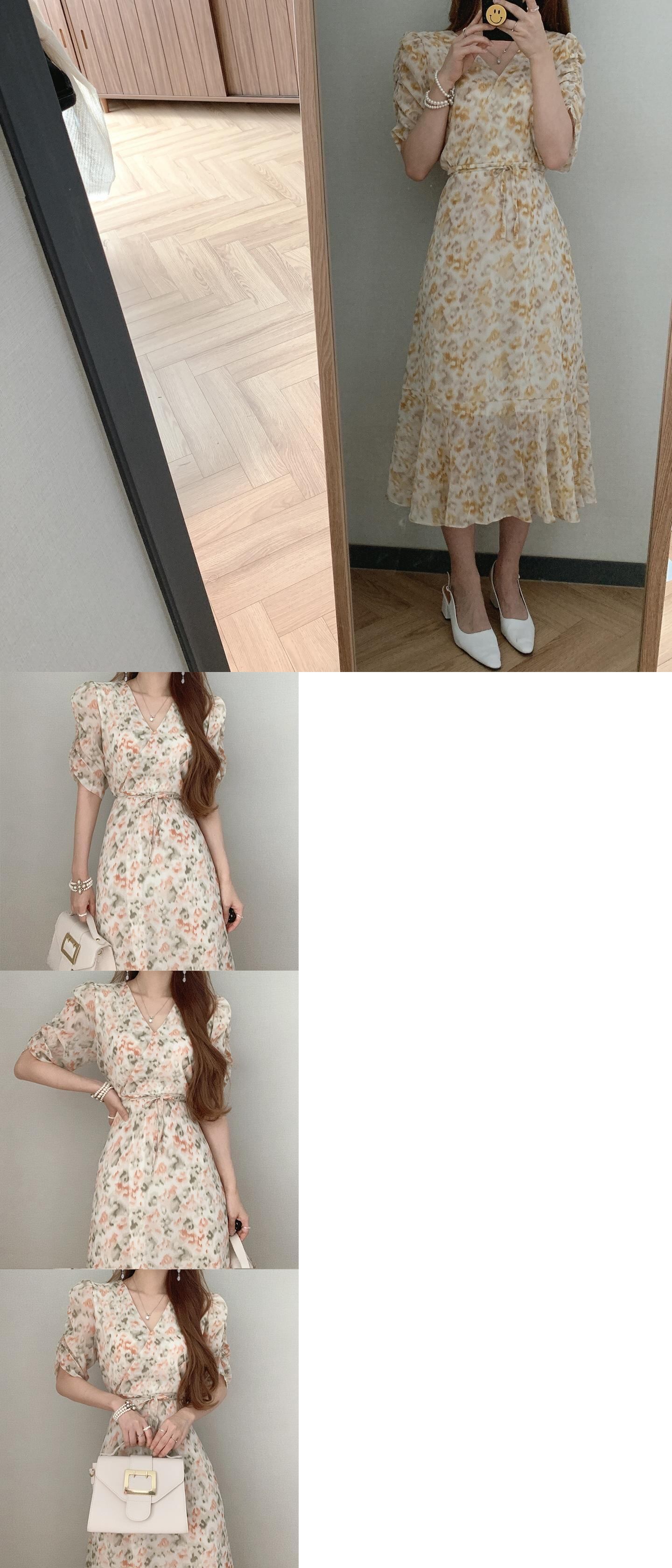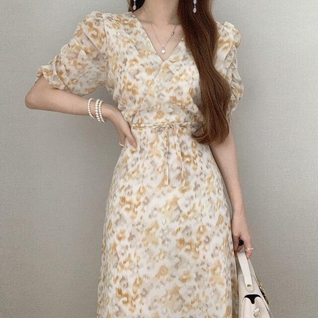 Vネックウェストドレス サマーフローラルシフォンスカート 夏物 花柄 韓国婦人96938137502