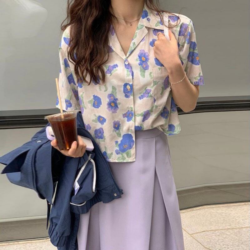 スカート サマースタンダードFlowerデザイン シャツ レトロ 夏物 フラワーデザイン パープル 韓国婦人30969111396