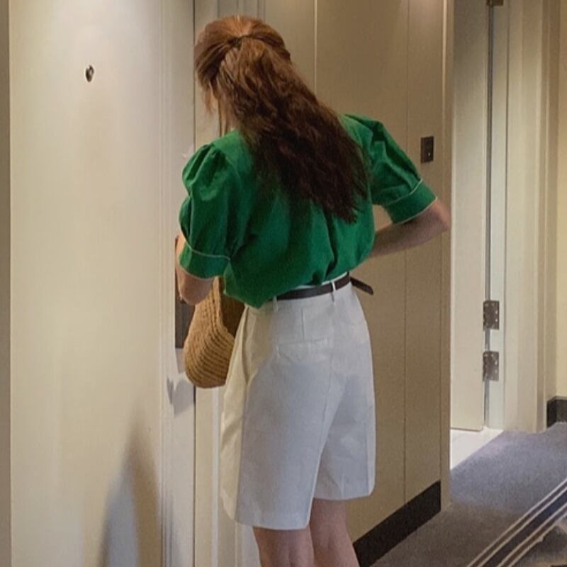 サマースタンダードカラースリーブシャツ カジュアルパンツ レディース レッド レトロ 夏物 韓国婦人88383592488