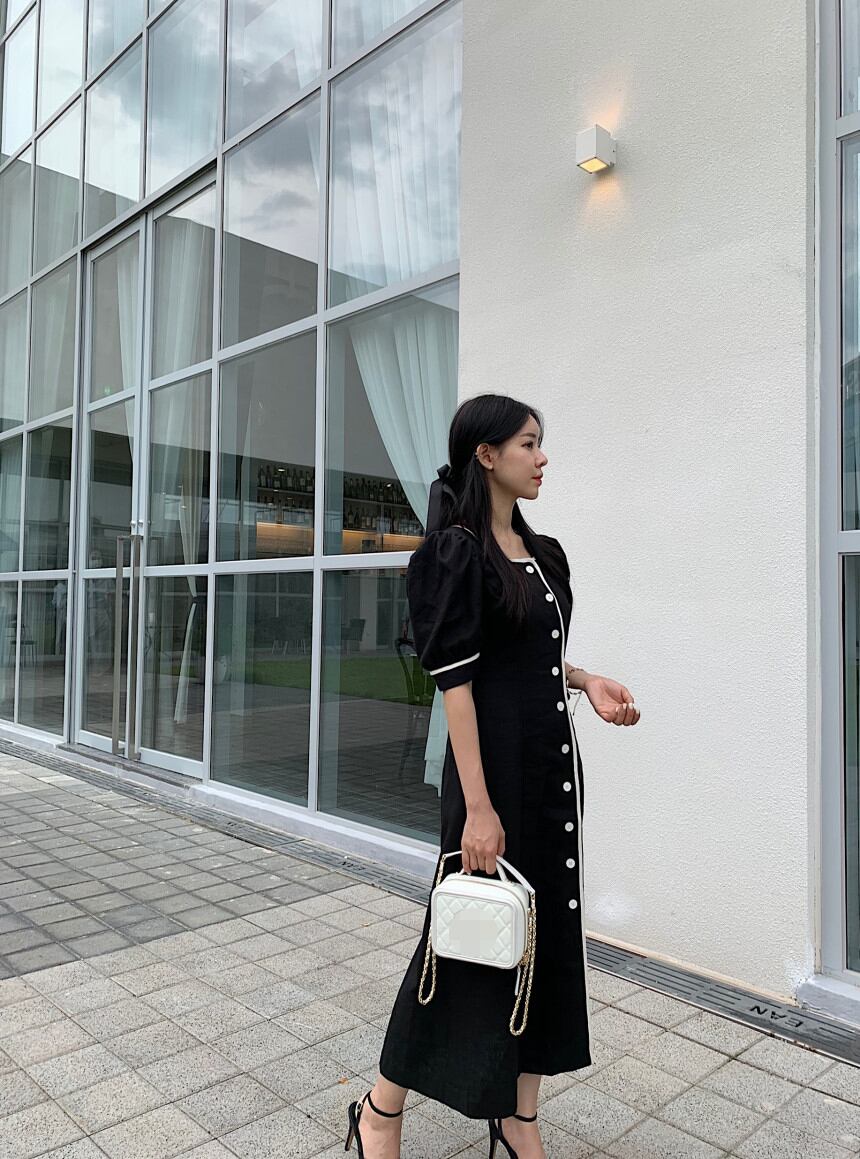 スタンダードカラーシングルブレスト薄手スリーブドレス サマーロングスカート レトロ 夏物 スクウェア 韓国婦人26844716489