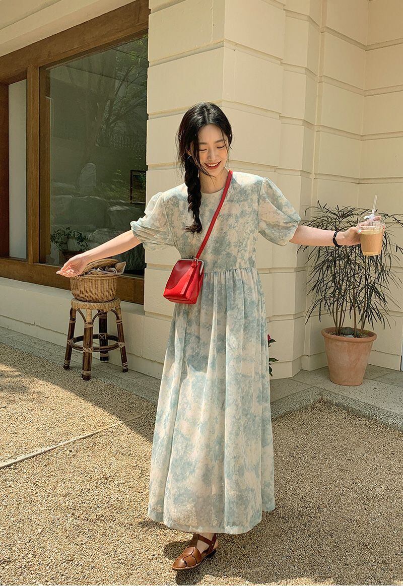 サマースタンダードスタイルプリントスリーブルーズ薄手シフォンロングドレス レトロ 夏物 韓国婦人51814782926