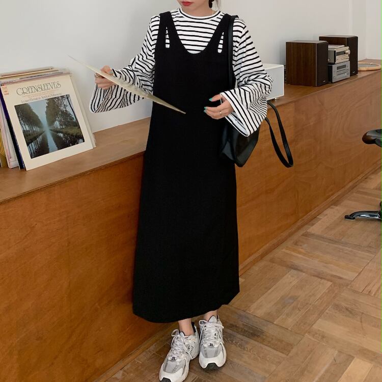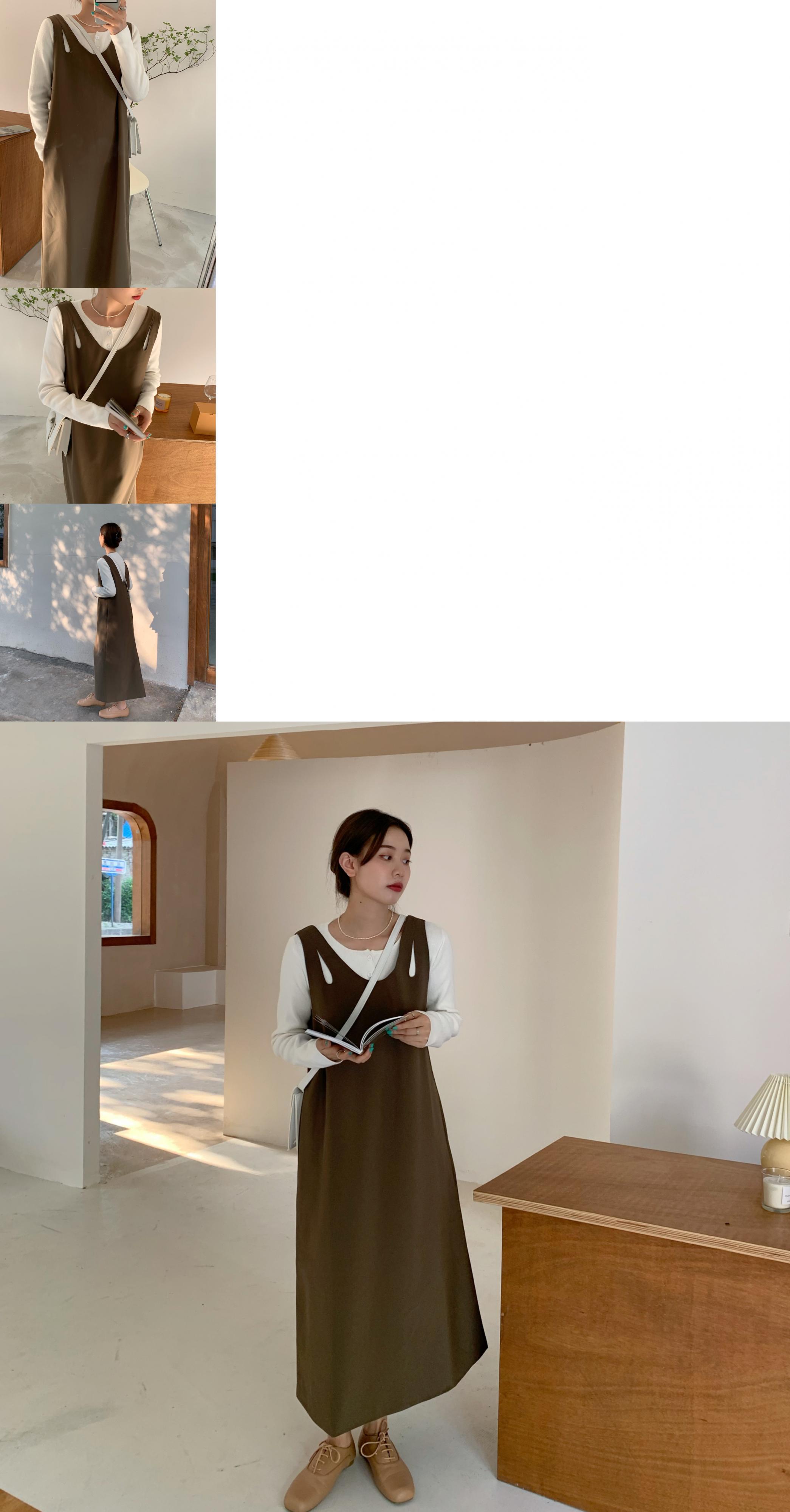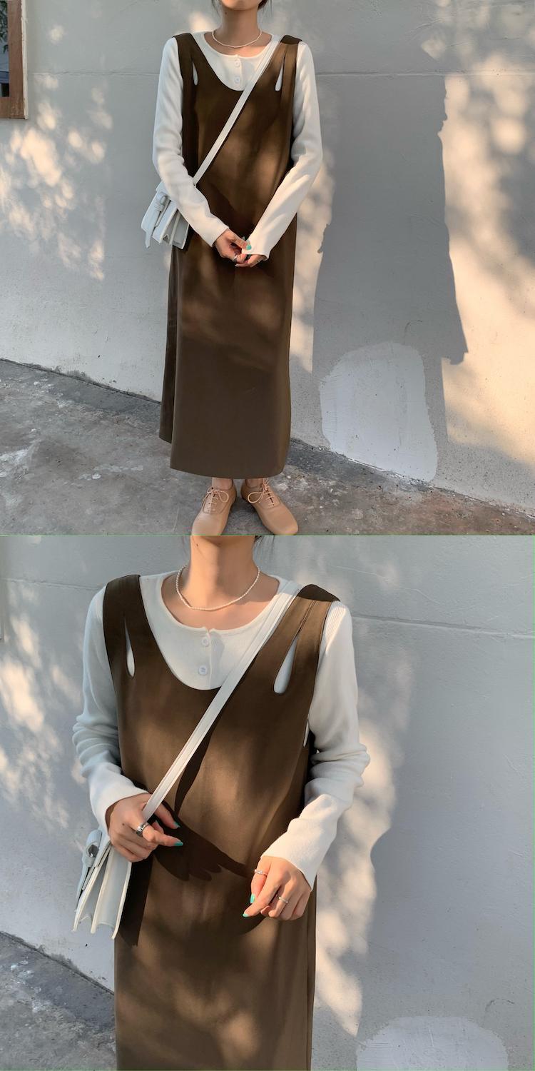 スプリングロングスカート スタンダードVネックルーズソリッド カラーノースリーブドレス レトロ 春物 ソリッドカラー 韓国婦人38263184560
