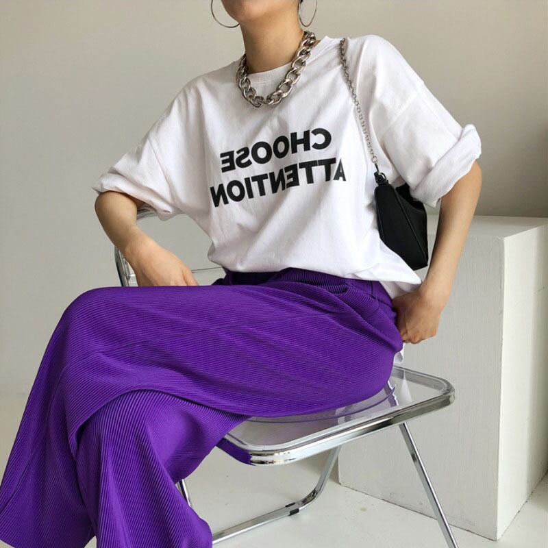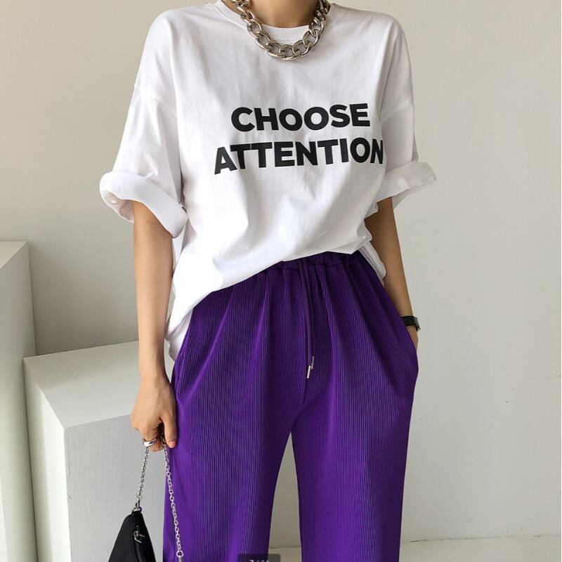 色:白いTシャツ,黒いTシャツ,パープルパンツ