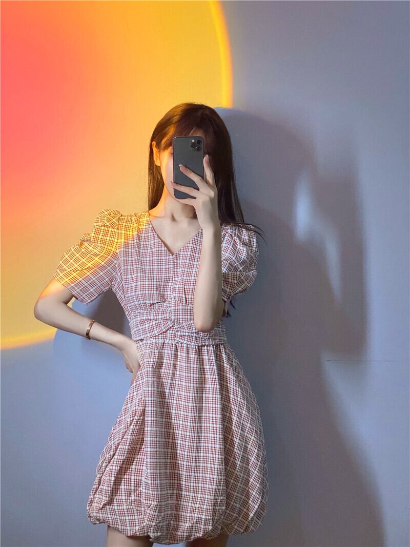 サマースタンダードVネックウェストスリーブ格子柄ドレス ショートスカート レトロ 夏物 韓国婦人23197407673