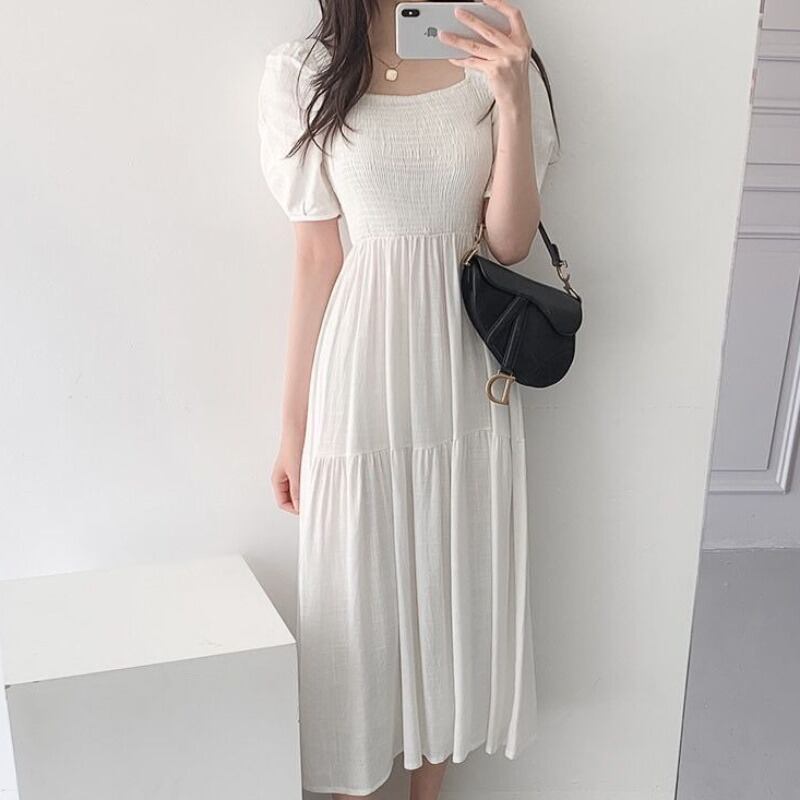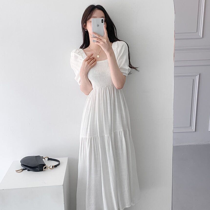 サマープリーツスリーブウェストロングドレス レディース 夏物 スクウェア 韓国婦人65607258882