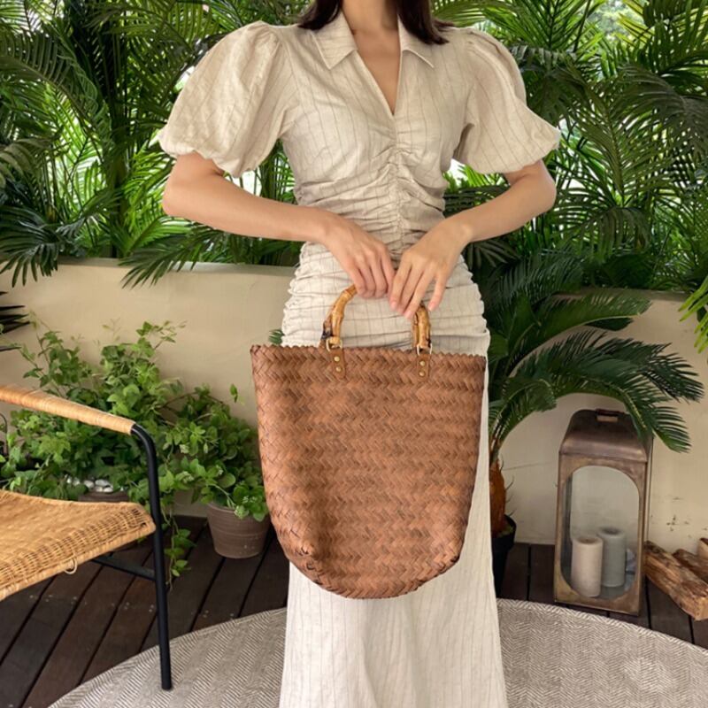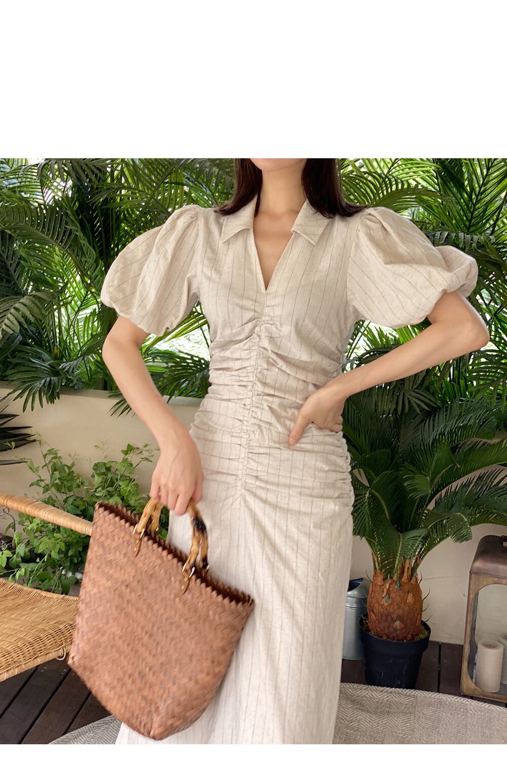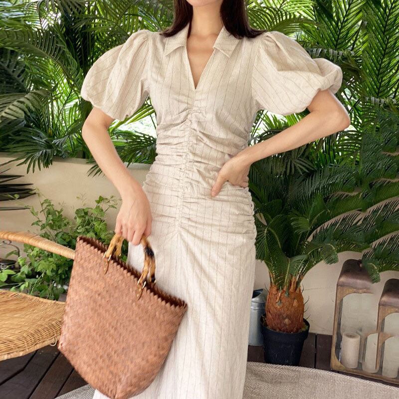 サマースタンダードVネックロングストライプドレス レディース ランタンスリーブ レトロ 夏物 韓国婦人96926659005