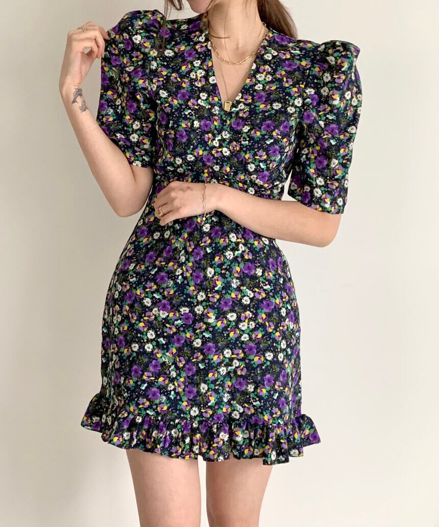 サマースタンダードVネックウェストスリーブショートフローラルドレス レトロ 大人ガーリー スウィート キュート カジュアル エレガント 夏物 花柄 韓国婦人4702013764