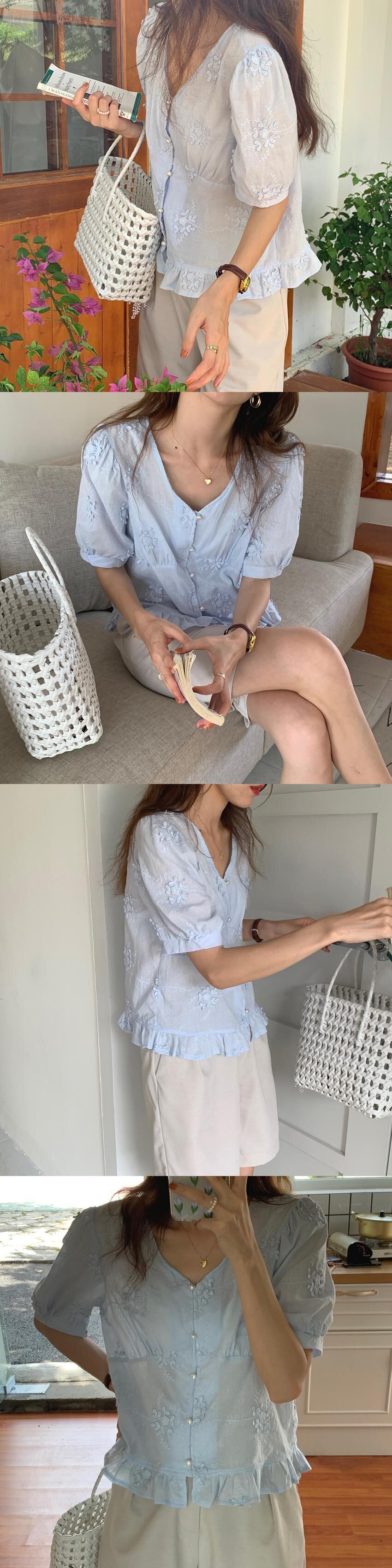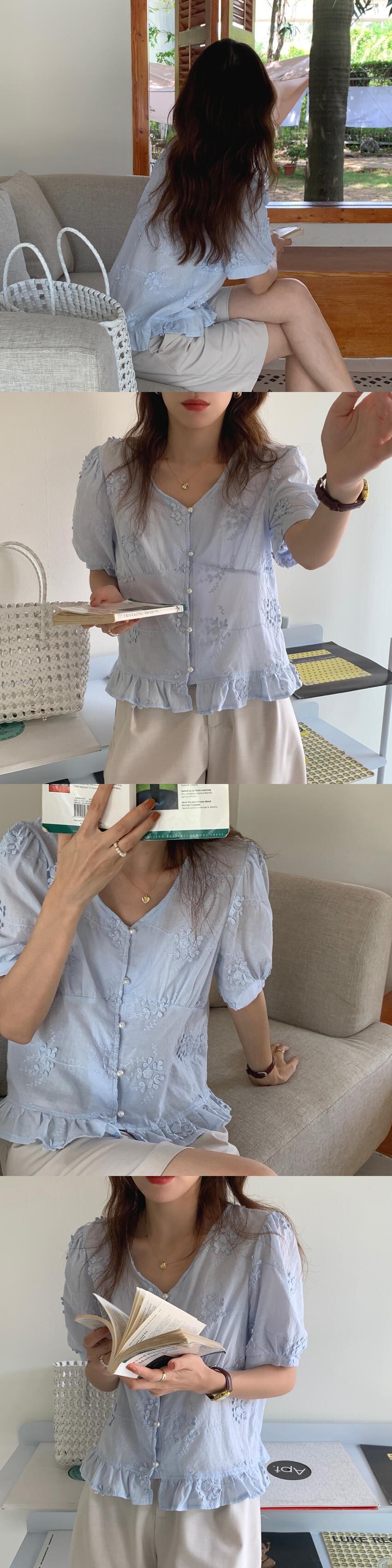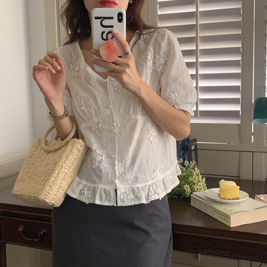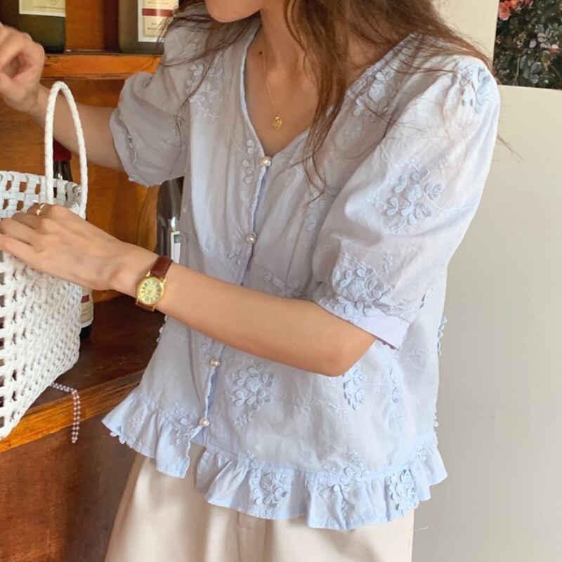 サマーVネックパールボタンスリーブ刺繍シャツ 夏物 真珠 ステッチ 韓国婦人35509665155