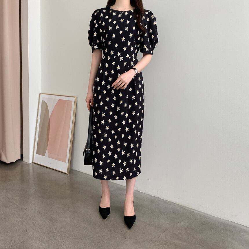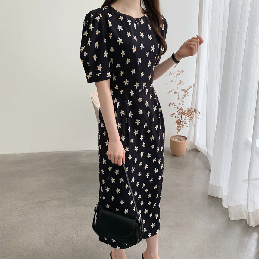 サマースタンダードスリーブラウンドネックフローラルウェスト薄手ドレス レディース レトロ 夏物 花柄 Oネック 韓国婦人99235365038