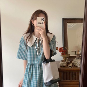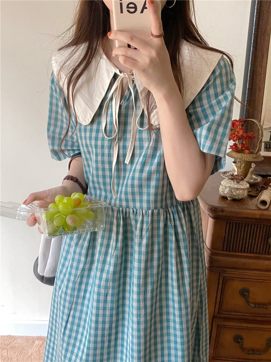 サマースタイルルーズカジュアルハイウェストウェストカラー格子柄ドレス 夏物 韓国婦人33609168476