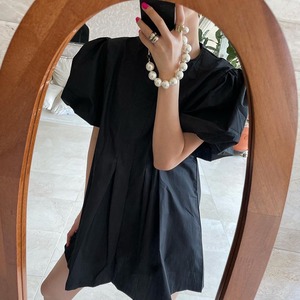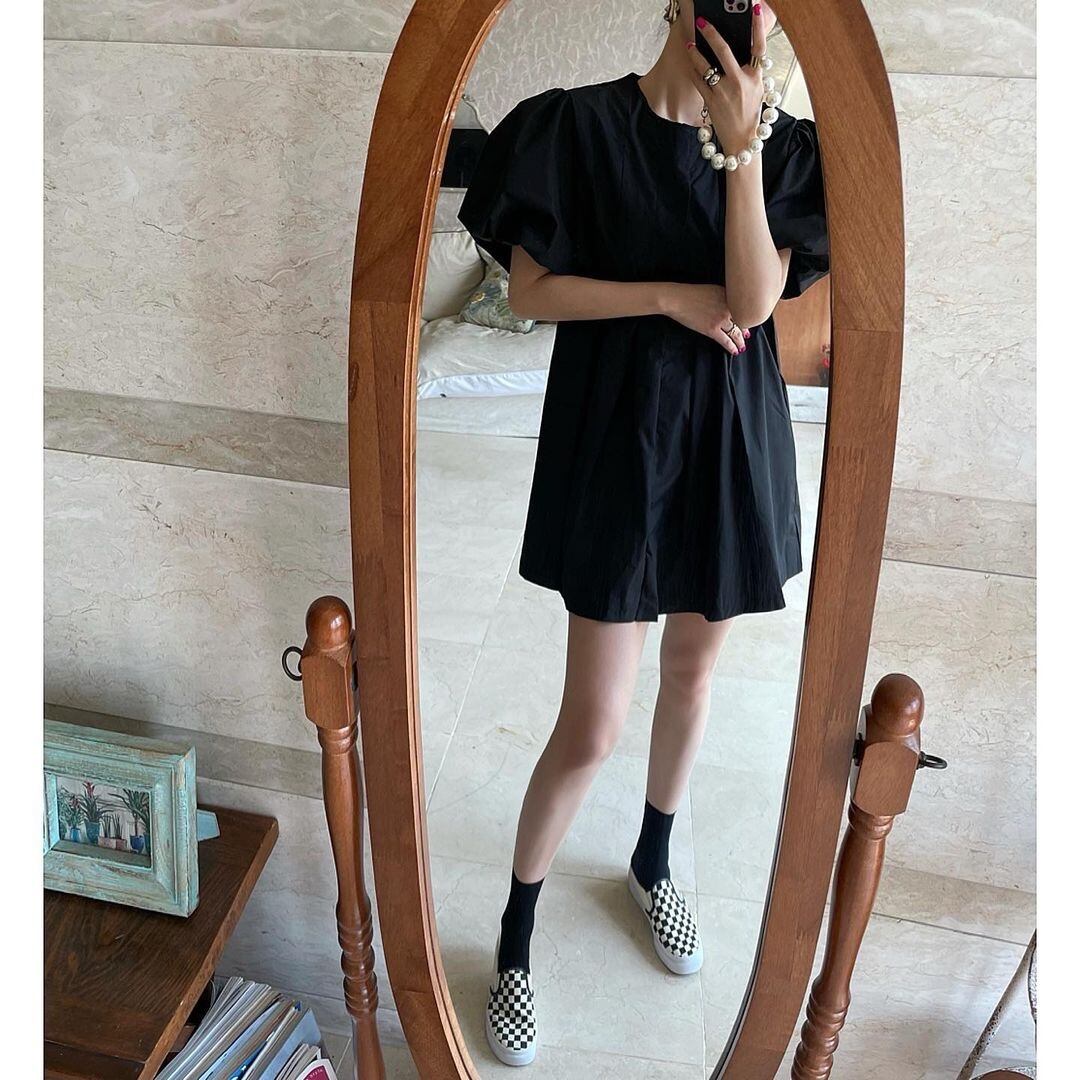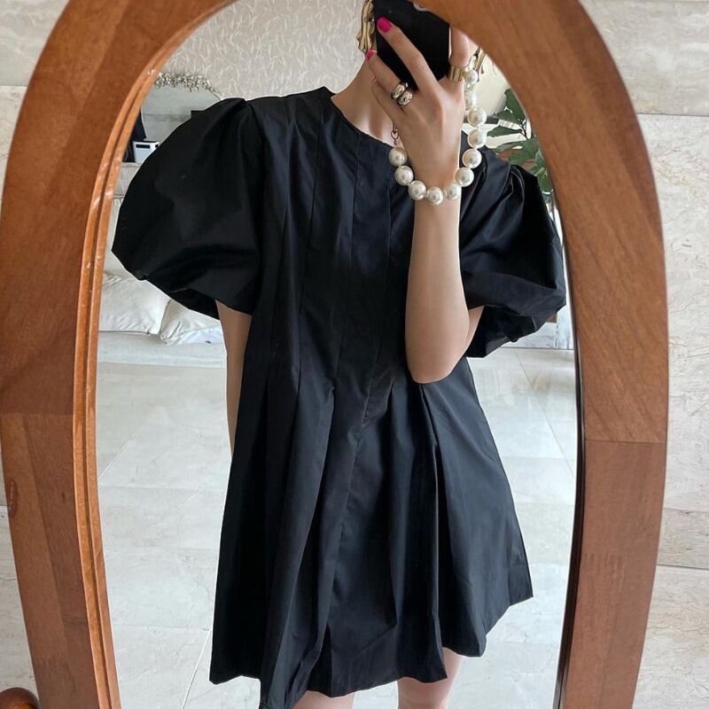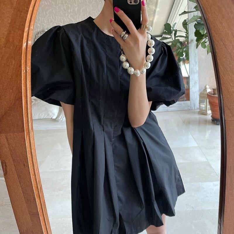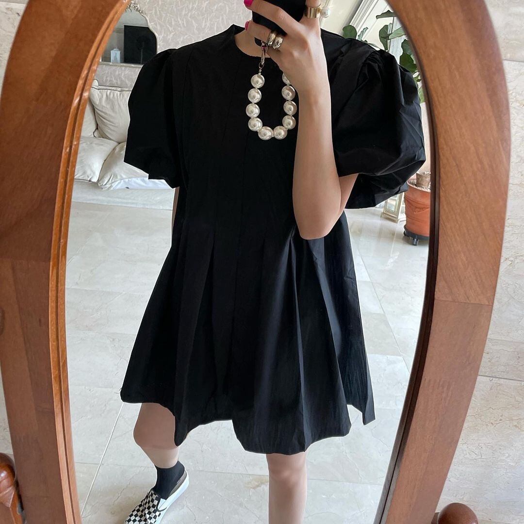 サマースタンダードラウンドネックプリーツルーズショートスリーブドレス ブラック レトロ 夏物 Oネック 韓国婦人74886246491