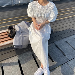 ロングスカート サマースタンダードラウンドネックプリーツスリーブソリッド カラーウェスト薄手ドレス レトロ 夏物 Oネック ソリッドカラー 韓国婦人72776538248