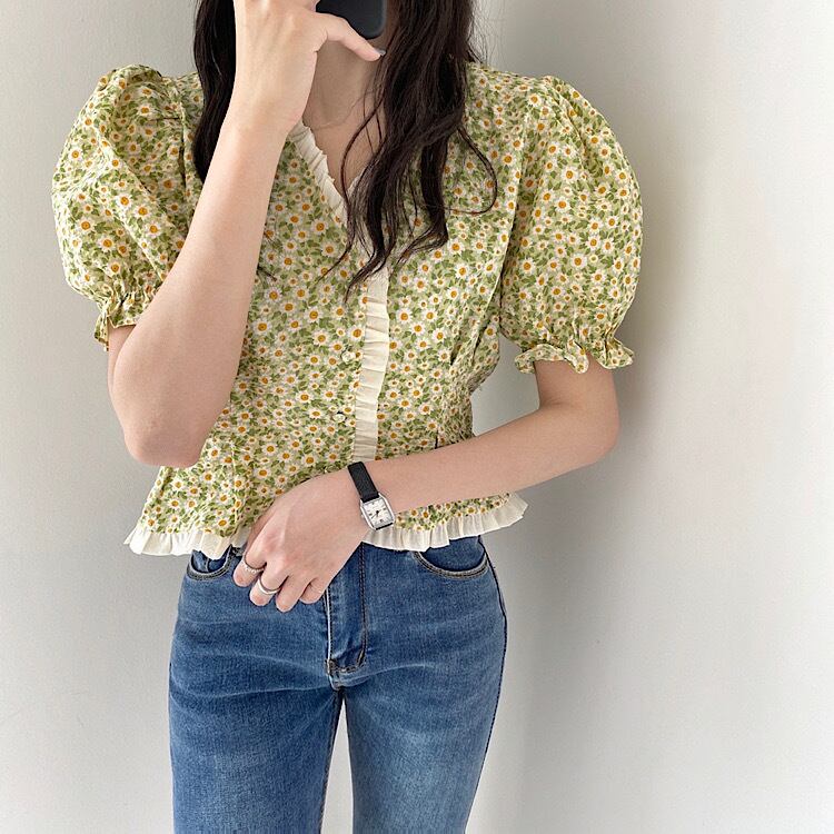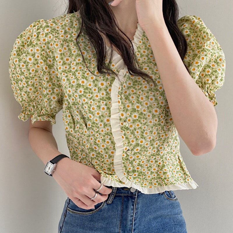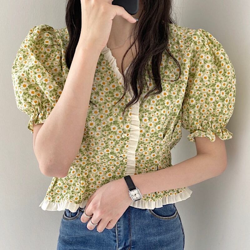 サマースリーブ半袖シャツ スタンダードフローラルシフォン ショート レトロ ハーフスリーブ 大人ガーリー スウィート キュート カジュアル 夏物 花柄 ステッチ 韓国婦人68288941737