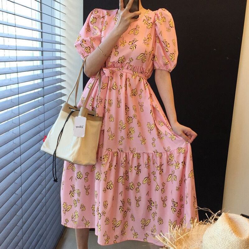 サマースタイルスリーブフローラルドレス ルーズ薄手ロングスカート 夏物 花柄 韓国婦人21353579187