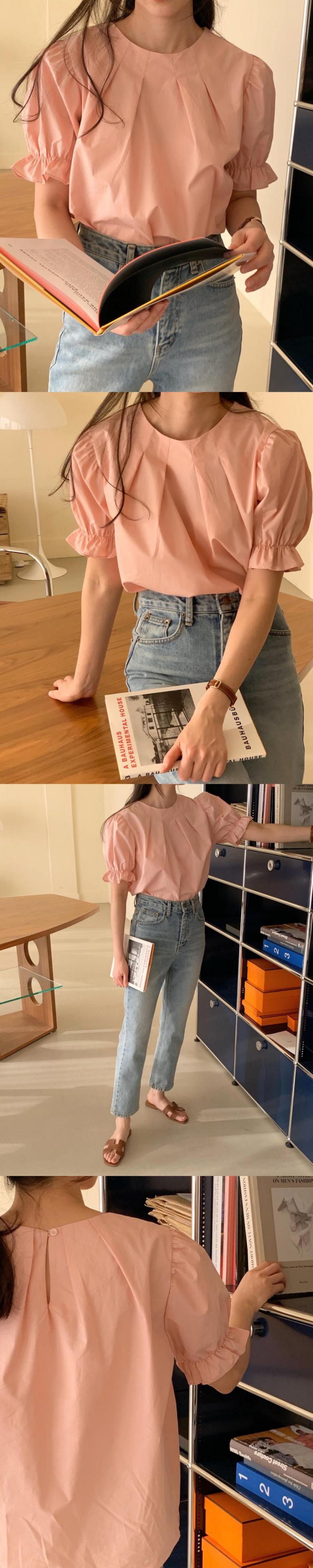 ラウンドネックプリーツスリーブシャツ ルーズソリッド カラートップス サマー 夏物 Oネック ソリッドカラー 韓国婦人82742409588