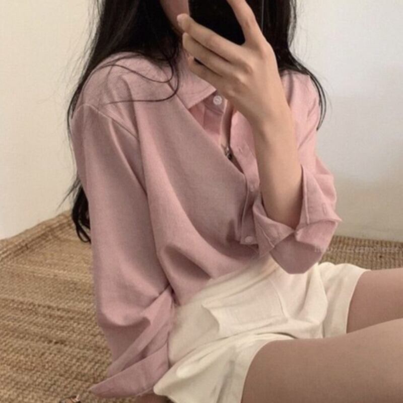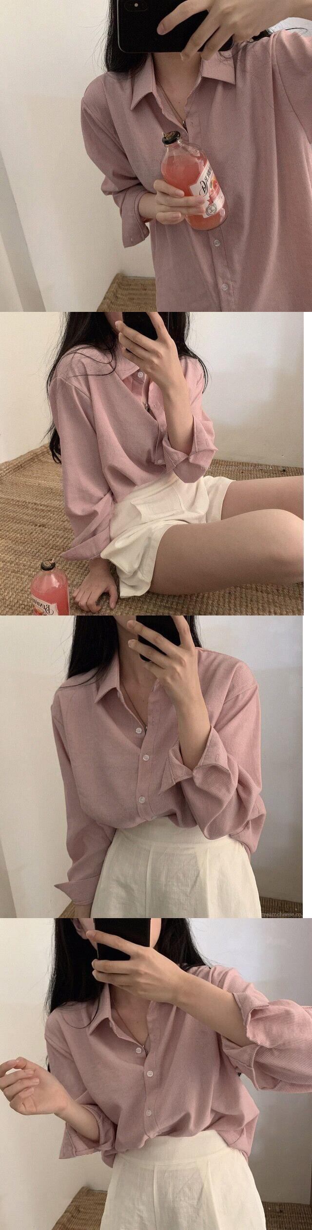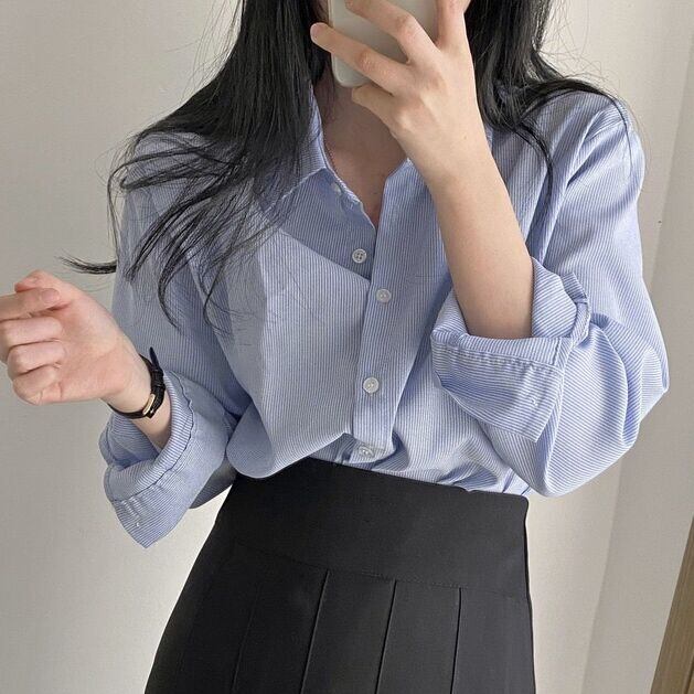 オータムストライプカラールーズシャツ トップス ロング 秋物 韓国婦人54787140179