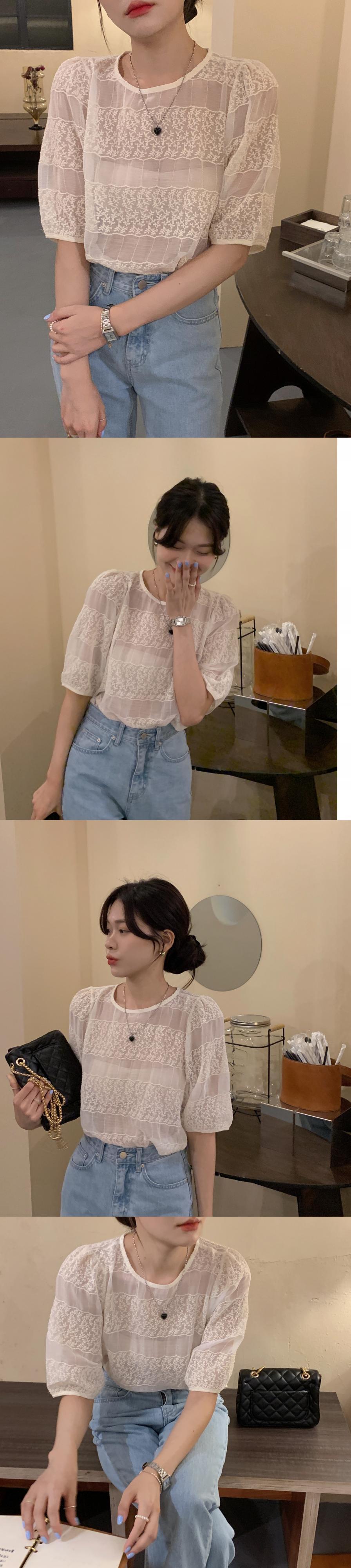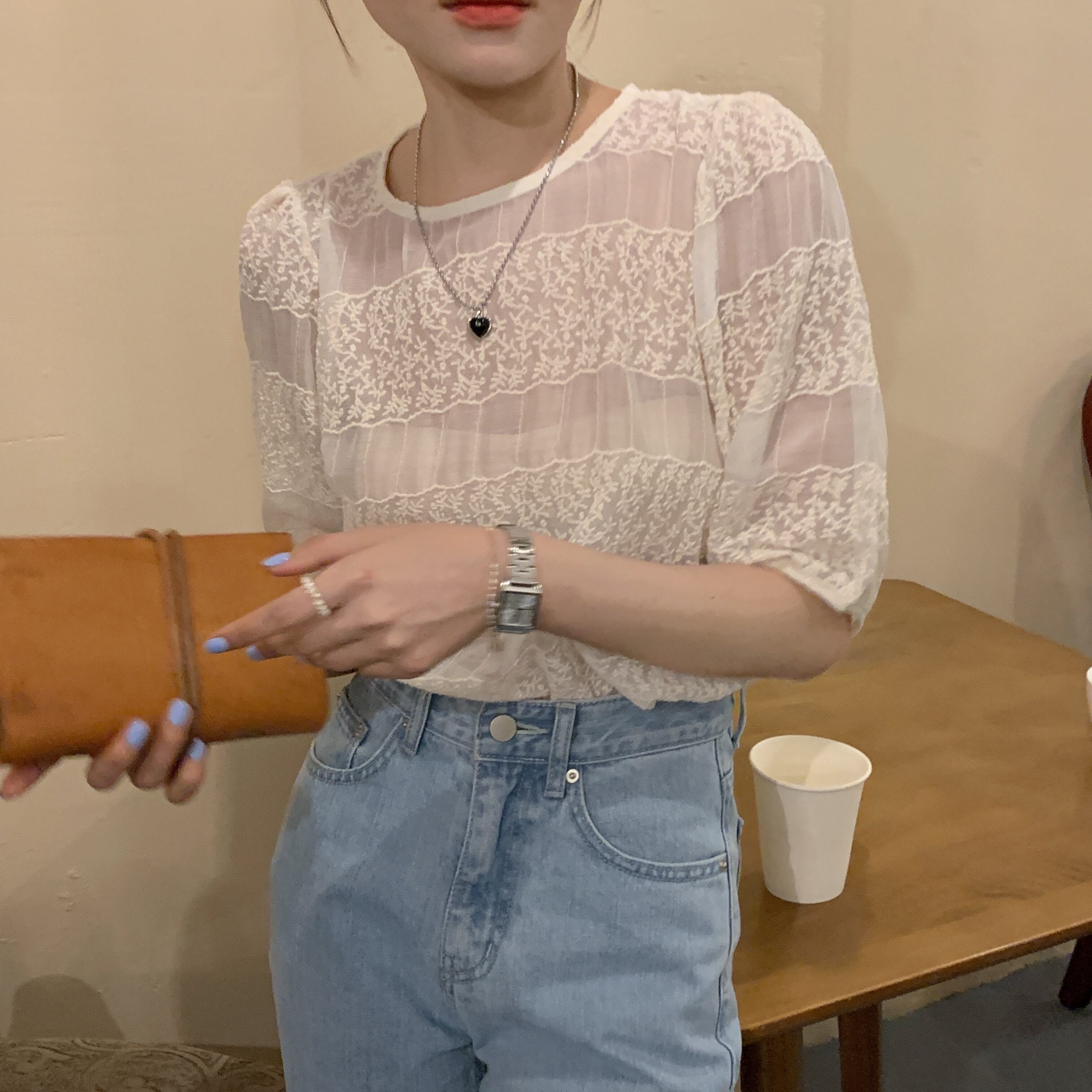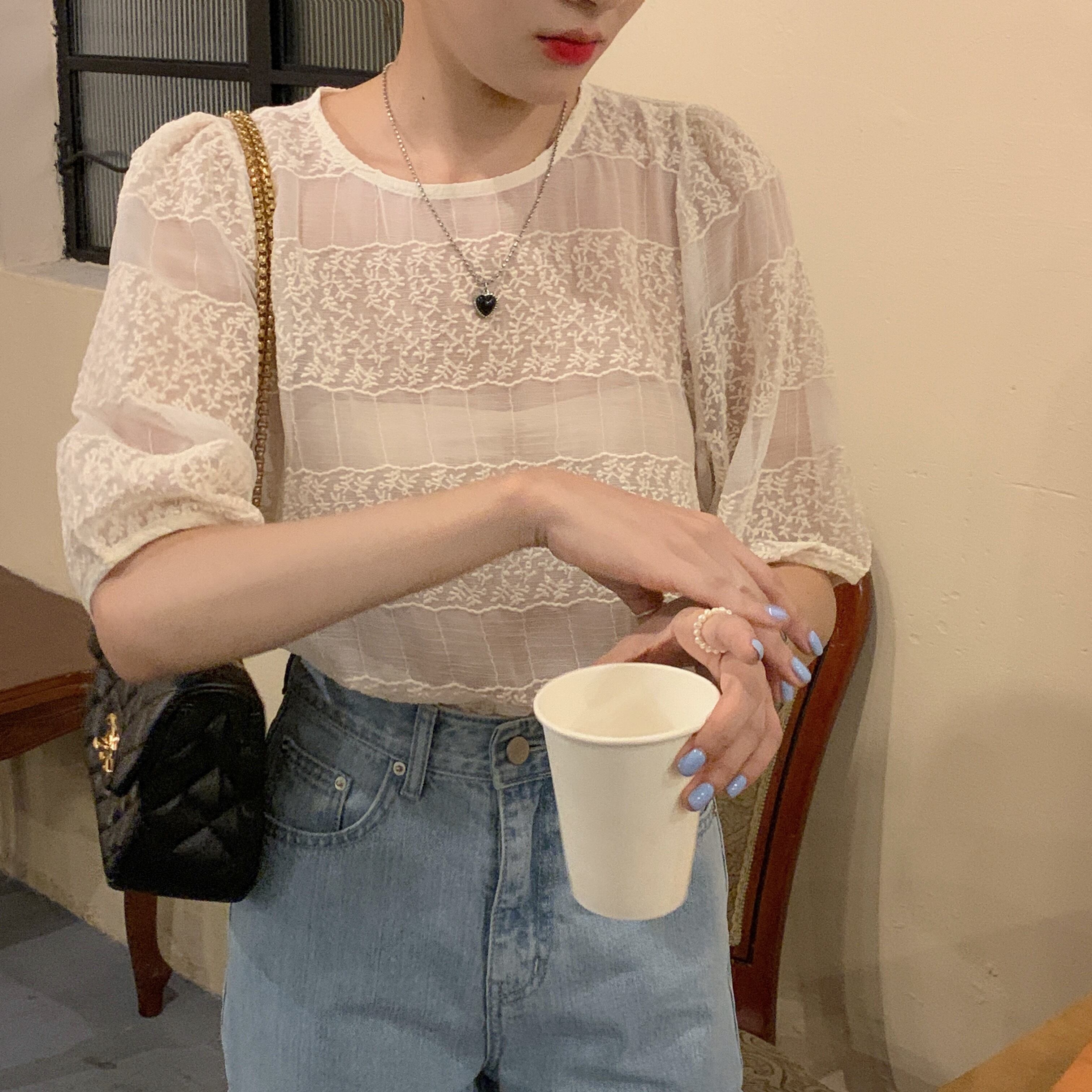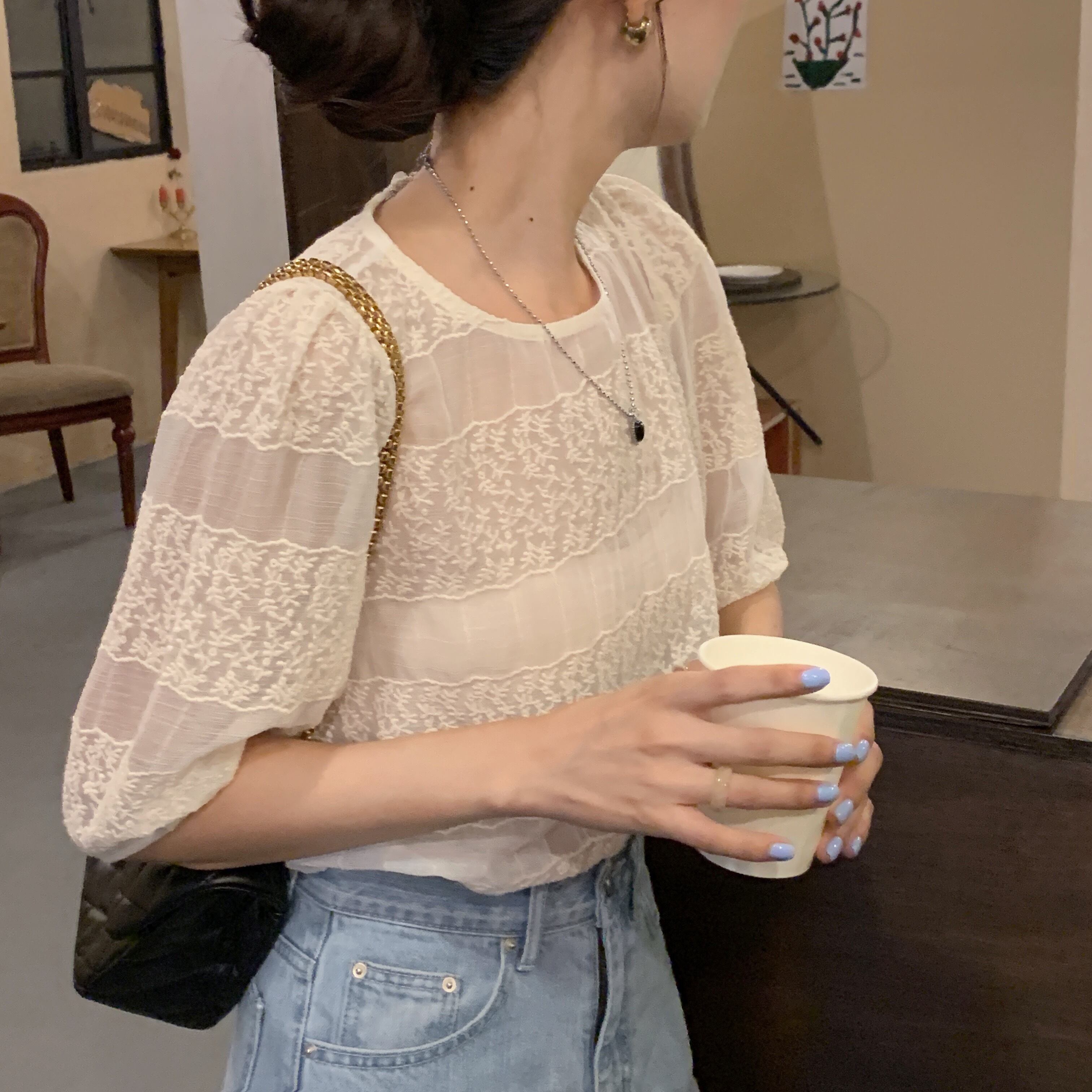 サマーラウンドネックスリーブ刺繍レースシフォンシャツ トップス レディース 夏物 Oネック 韓国婦人93731088587