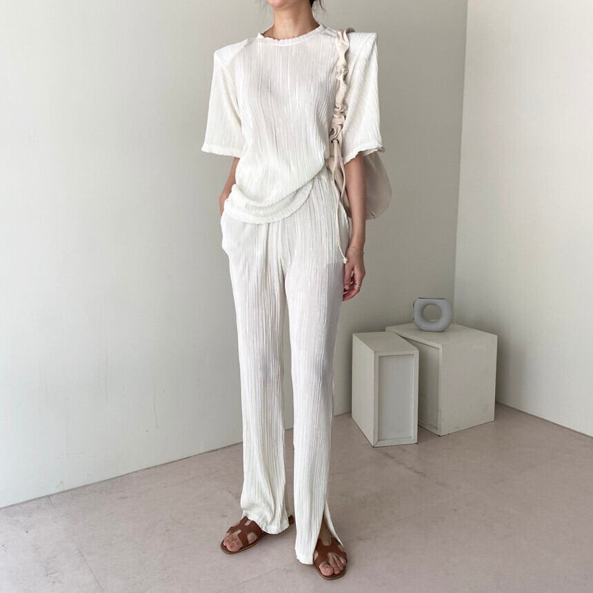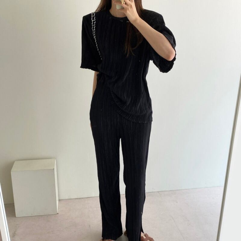 サマーラウンドネックトップス サイドスリットプリーツレディース 夏物 Oネック 韓国婦人54855738758
