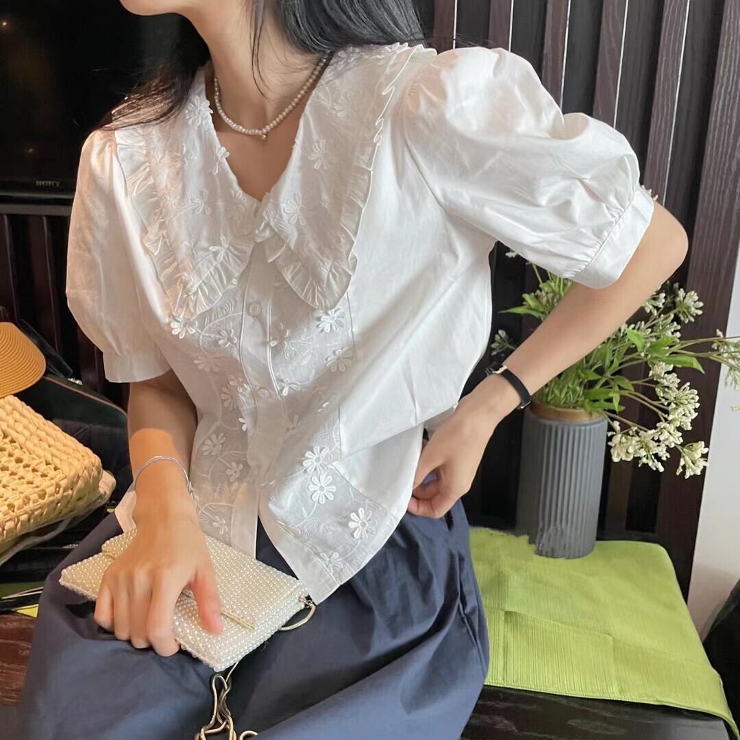 サマースタンダードホワイトカラースリーブ刺繍シャツ ブラウス レディース レトロ 夏物 韓国婦人93709292744