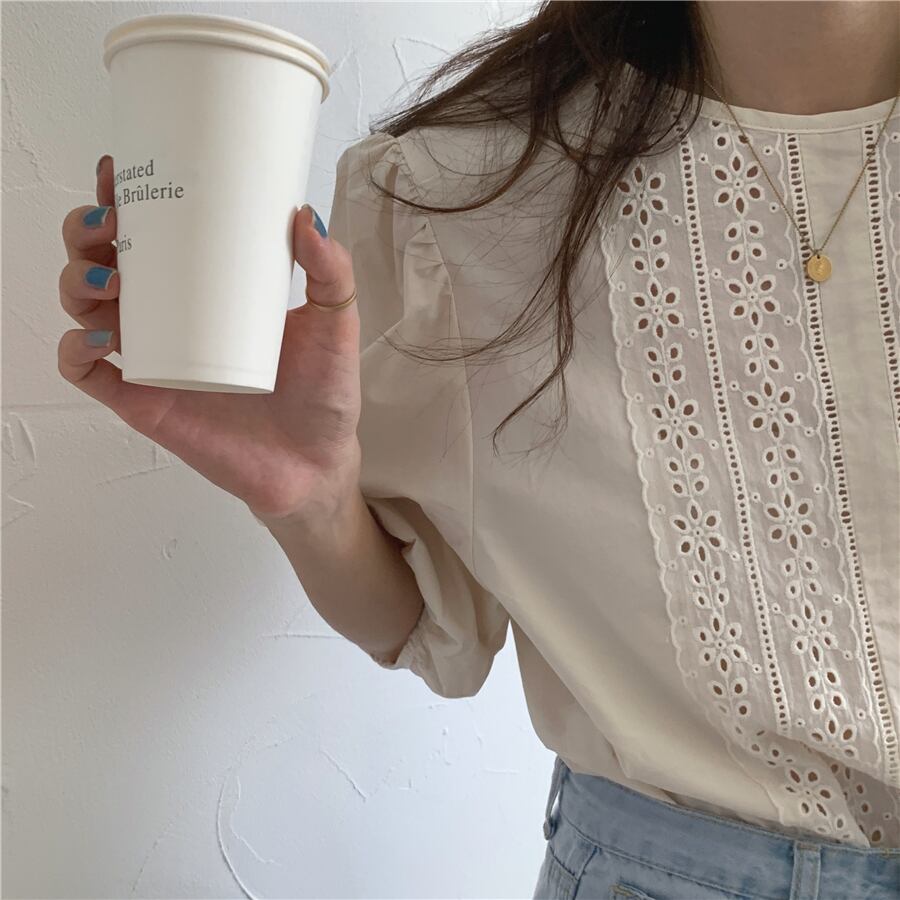 Flowerデザイン レースラウンドネックプルオーバー スリーブシャツ サマースタイルブラウス 夏物 Oネック フラワーデザイン ステッチ 韓国婦人35812395639