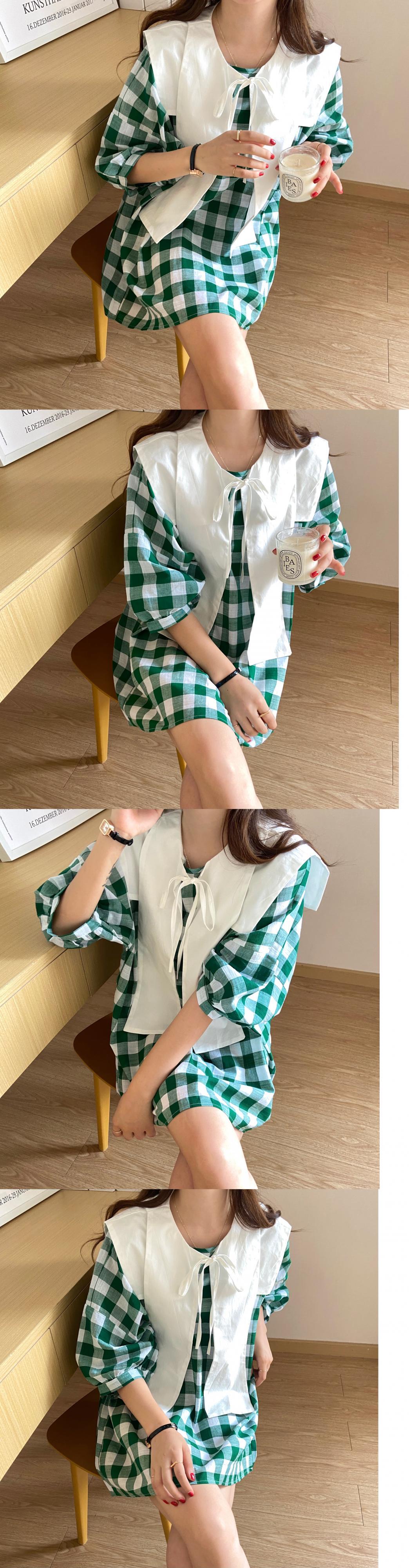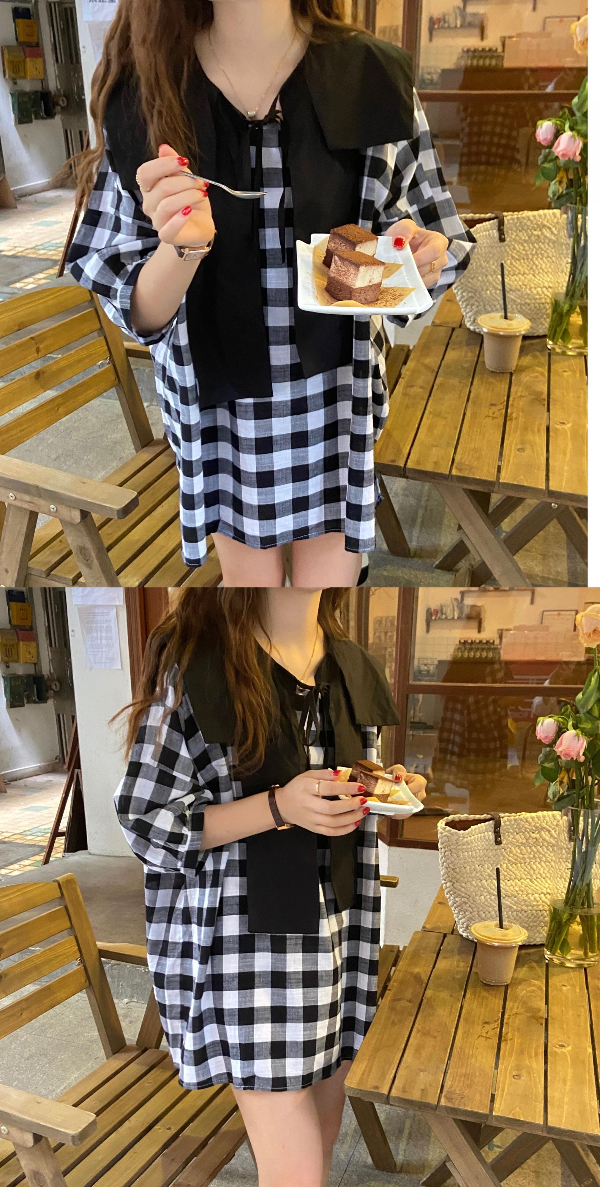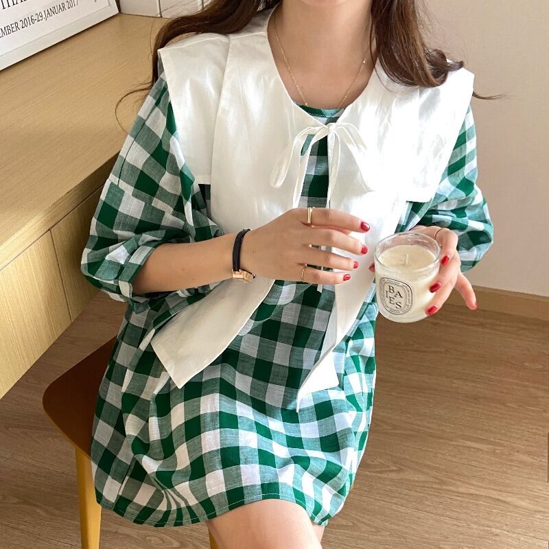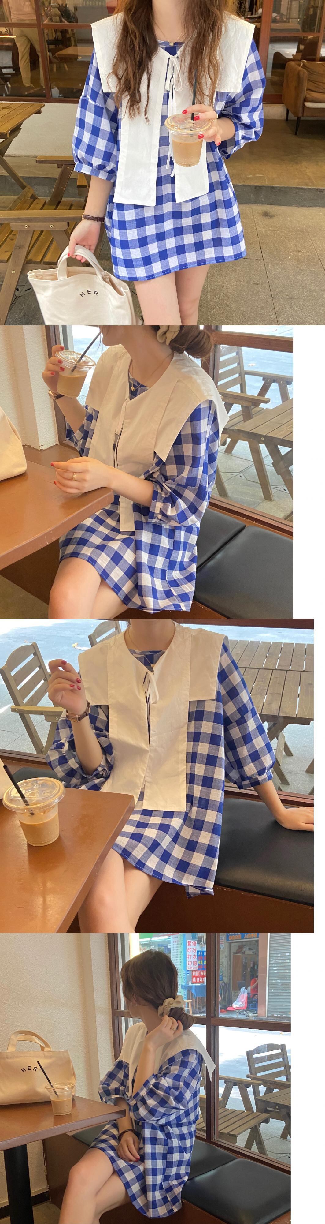 サマーネイビースタイル格子柄ドレス 夏物 韓国婦人45037824003