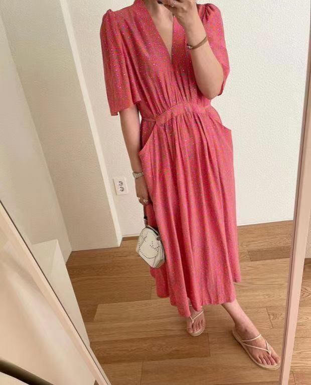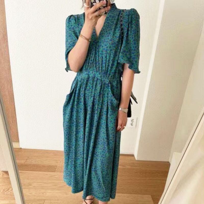 サマースタンダードVネックダブルウェストフローラルシフォンドレス レトロ 夏物 花柄 韓国婦人84598484973