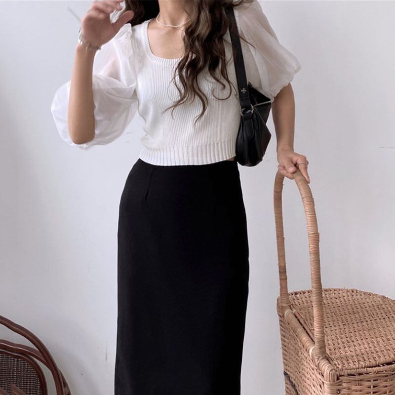 サマーニットスリーブトップス ハイウェストウェストスカート 夏物 ステッチ 韓国婦人41633484064