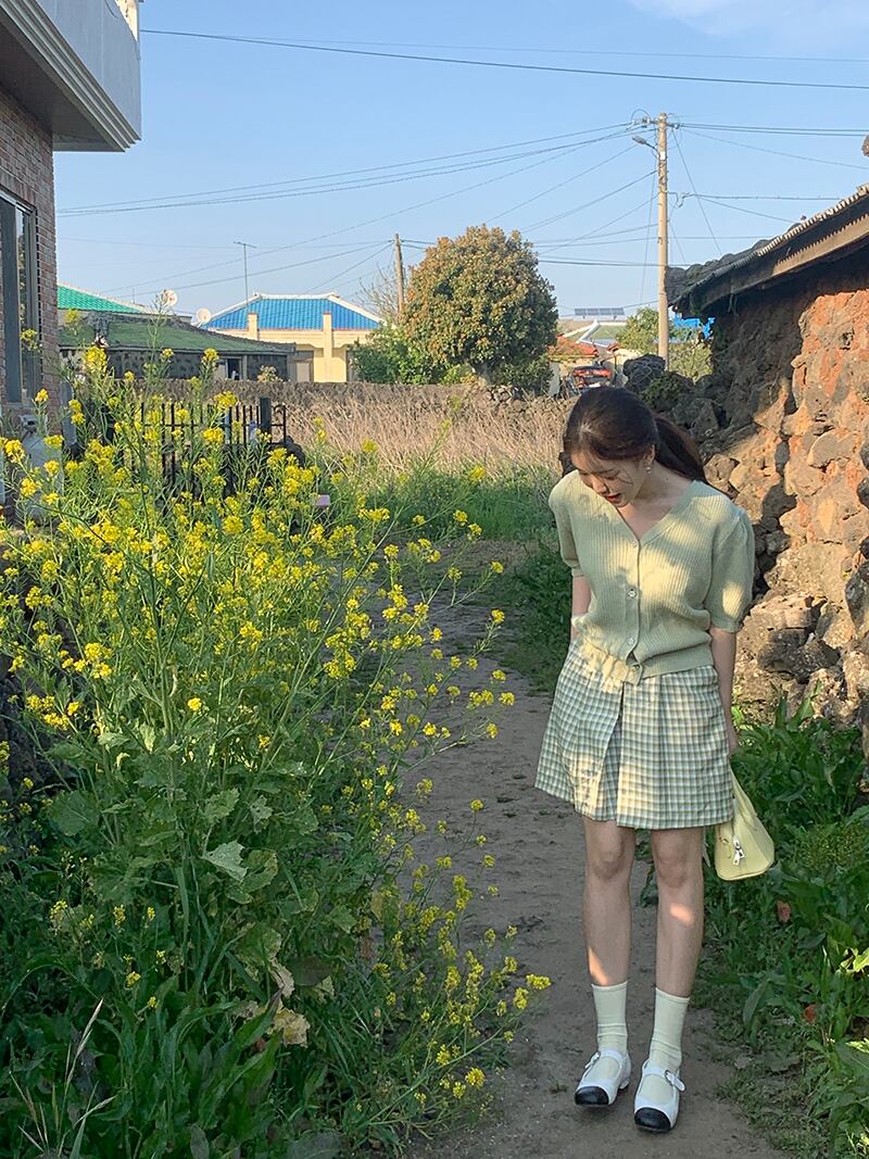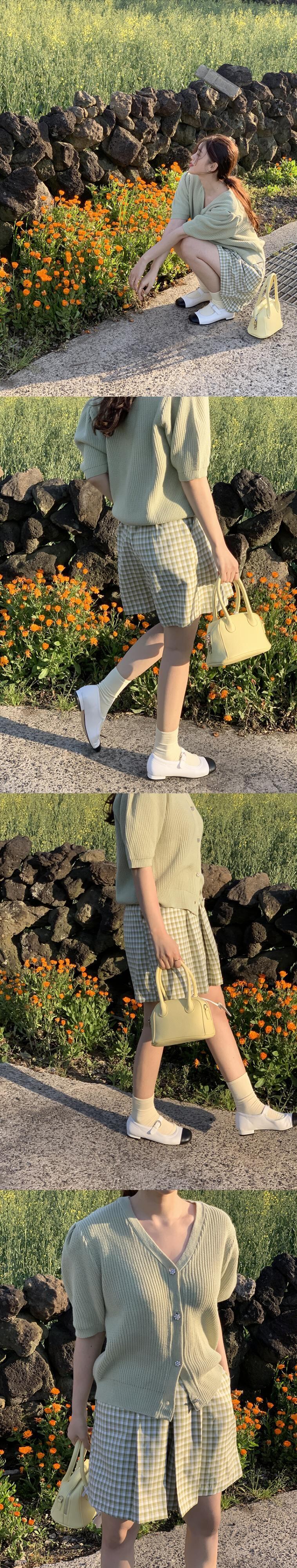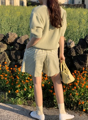 スタイルサマーグリーンボタンVネックセーター 格子柄カジュアルルーズショーツ 夏物 ブルマー 韓国婦人21120211958