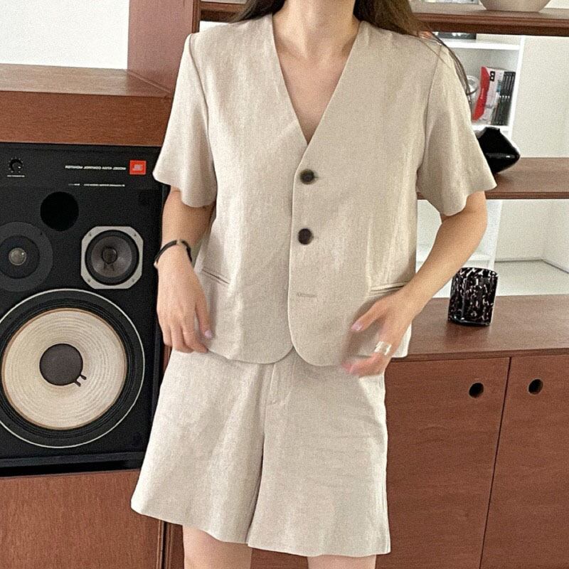 サマーVネックジャケット スタンダードカジュアルルーズショーツ レディース コットン レトロ 夏物 ブルマー 韓国婦人18779000227